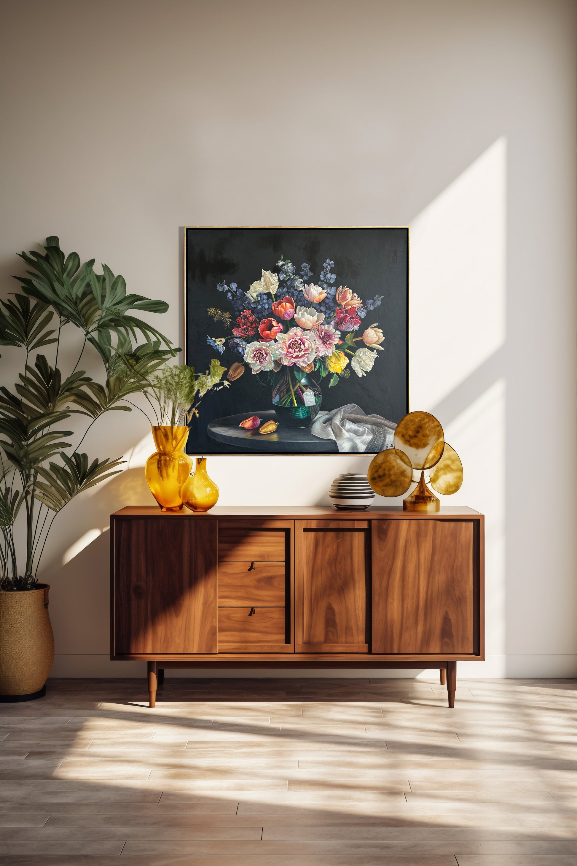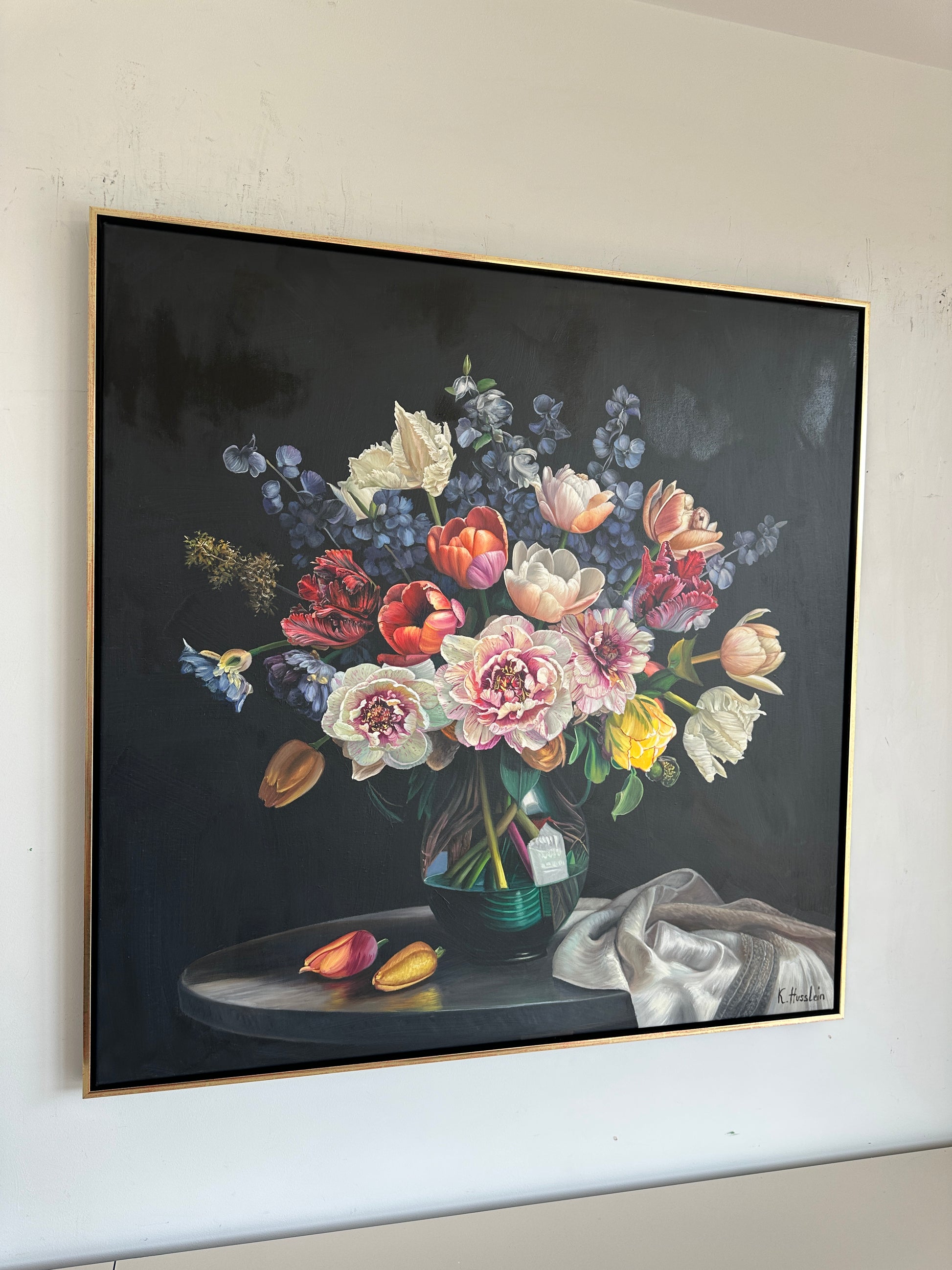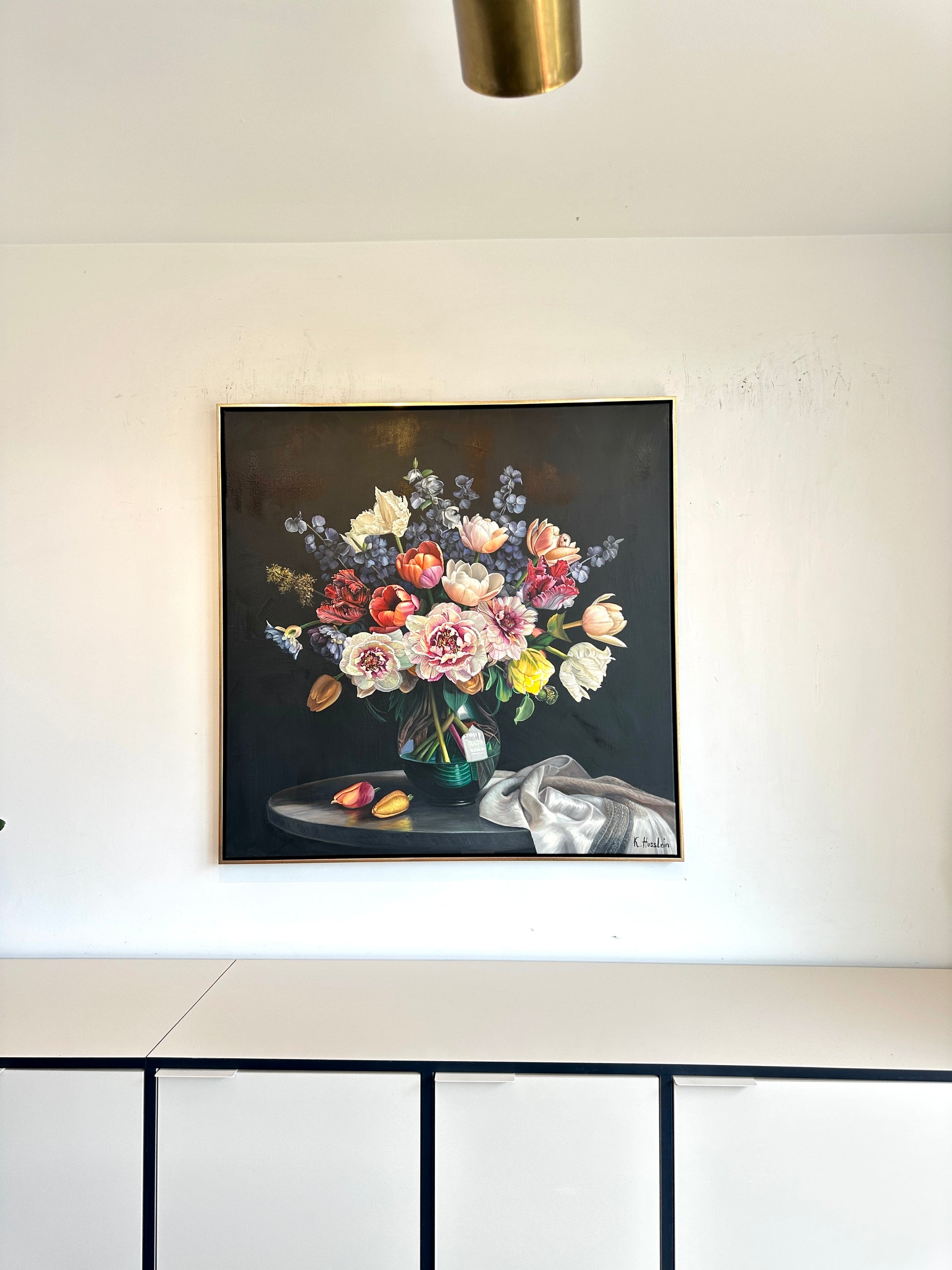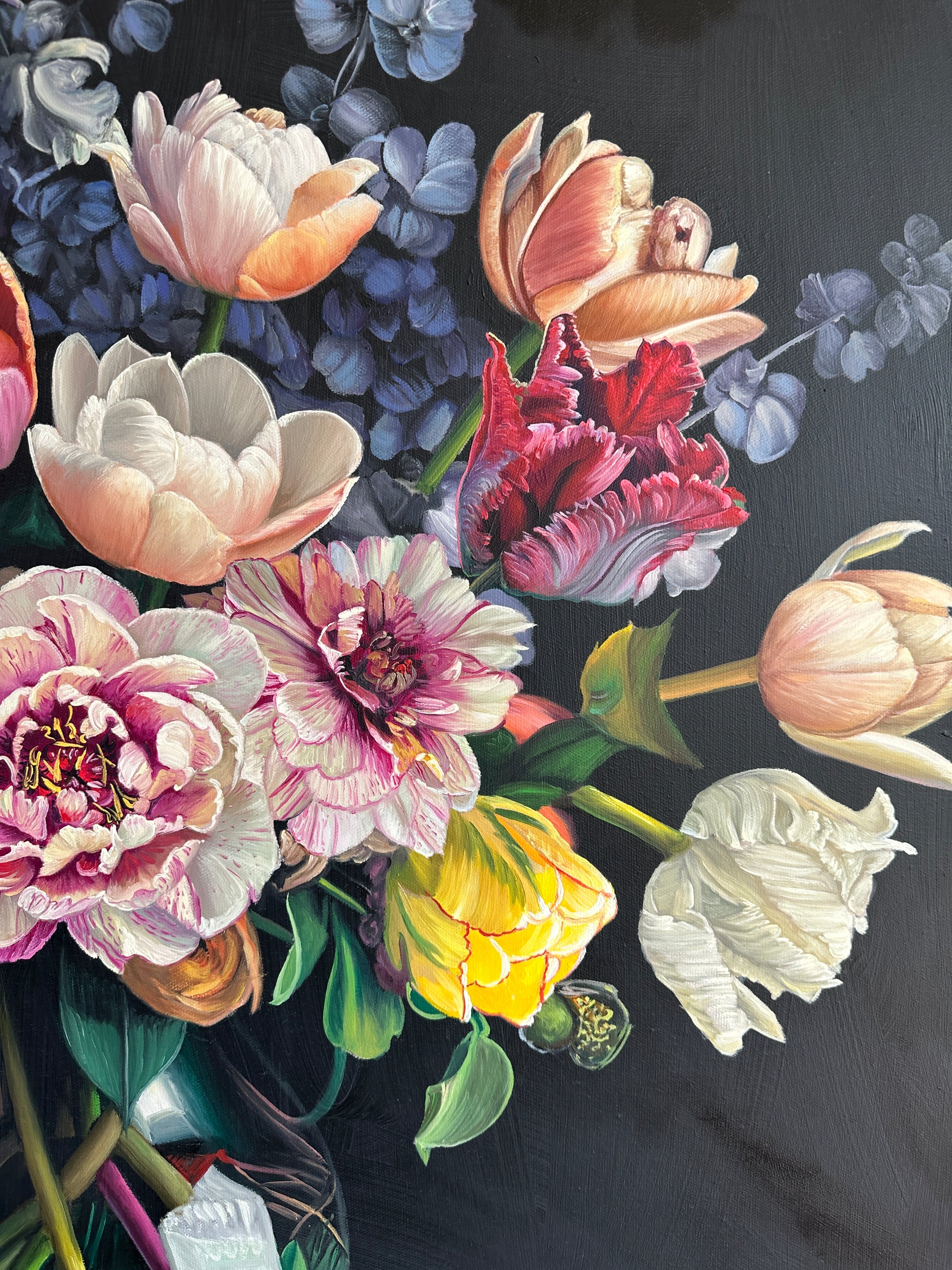 This is a beautiful oil painting of an array of flowers in a vase. Contemporary painting full of details and colors, vibrant roses , tulips, peonies and an arrangement of other flowers. Reminding us of old master paintings, this is a brand new painting full elegance and timeless elegance.