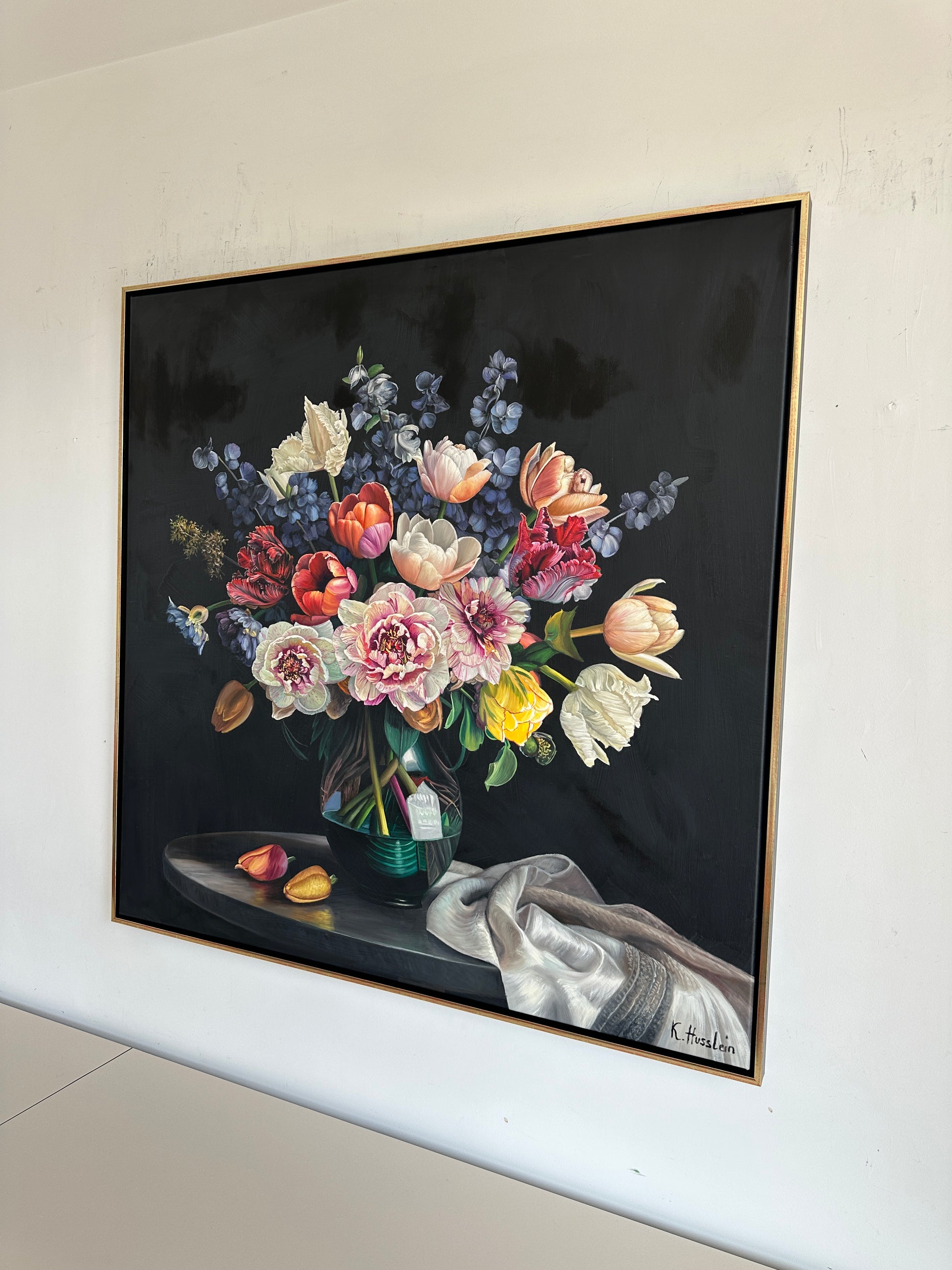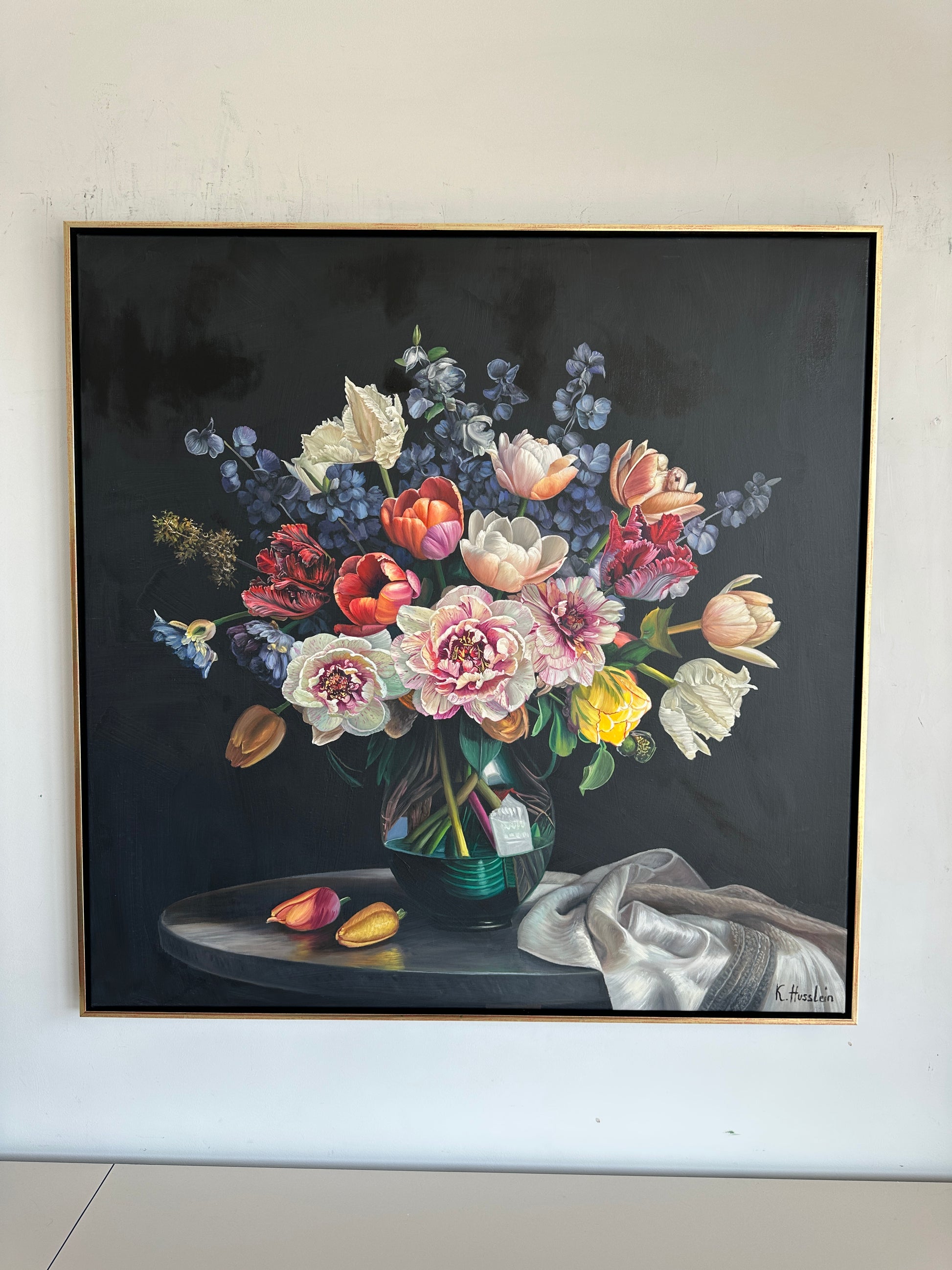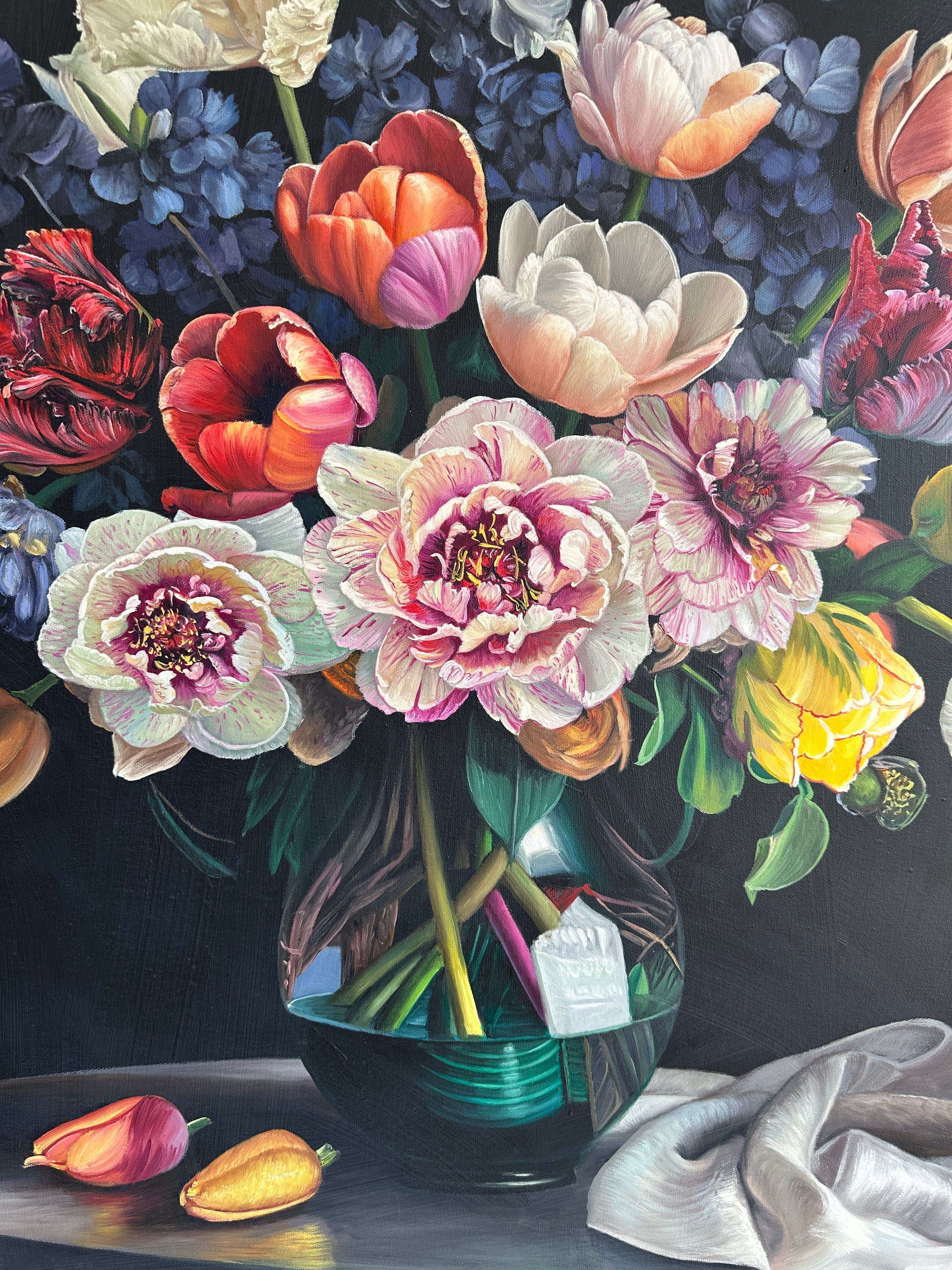 Husslein's artistic philosophy marries a reverence for classical masterpieces with the immersive allure of contemporary still life and botany. Her signature style is characterized by meticulous hyperrealism, particularly evident in her still-life floral compositions. Central to her creations are the visual and tactile attributes of flowers, intertwined with their symbolism evoking themes of love, femininity, and the natural world. These elements coalesce to fashion Husslein's vivacious and captivating compositions.