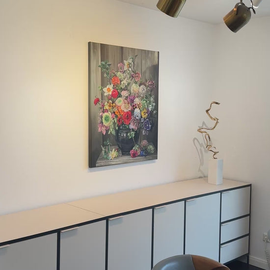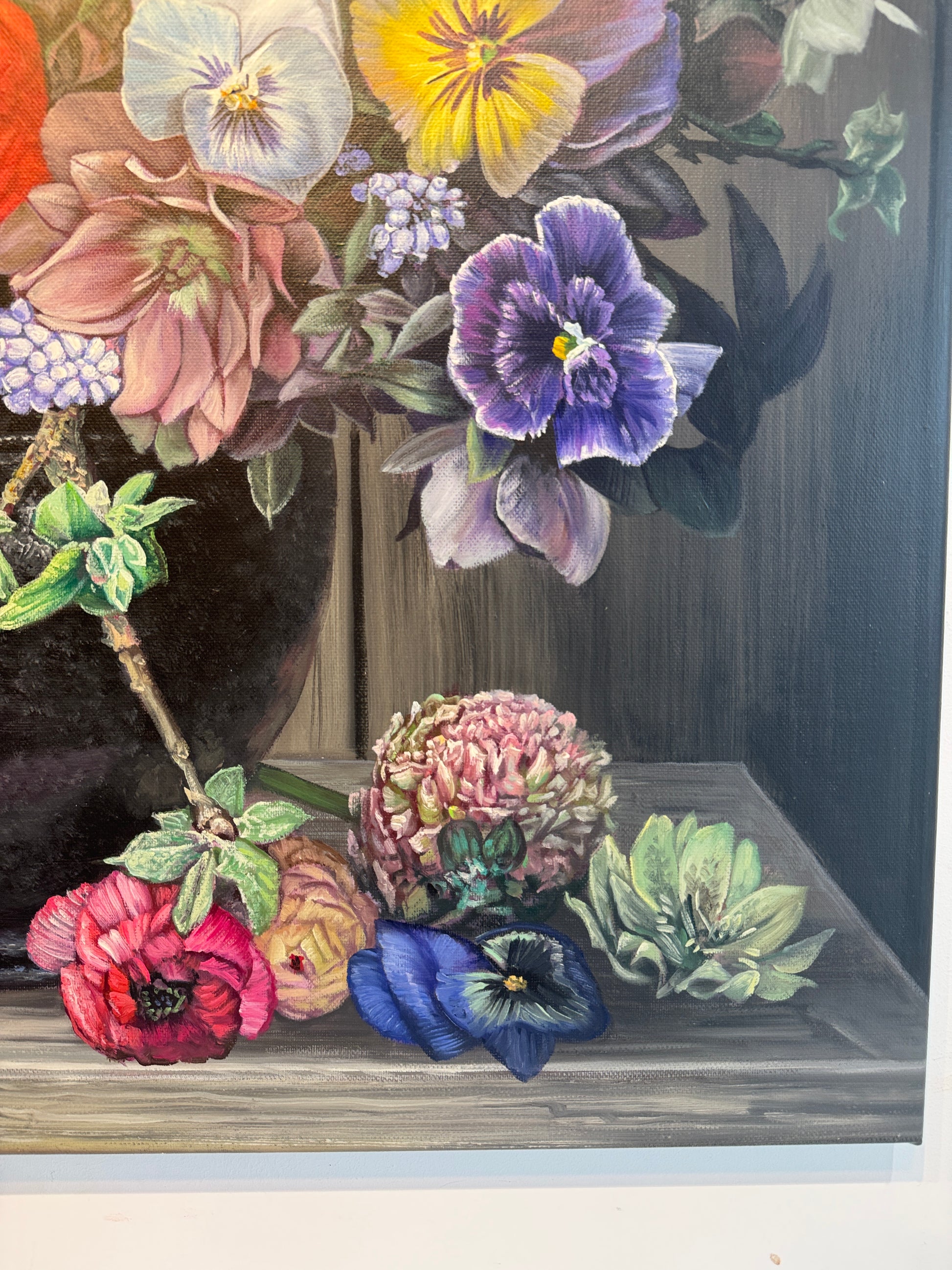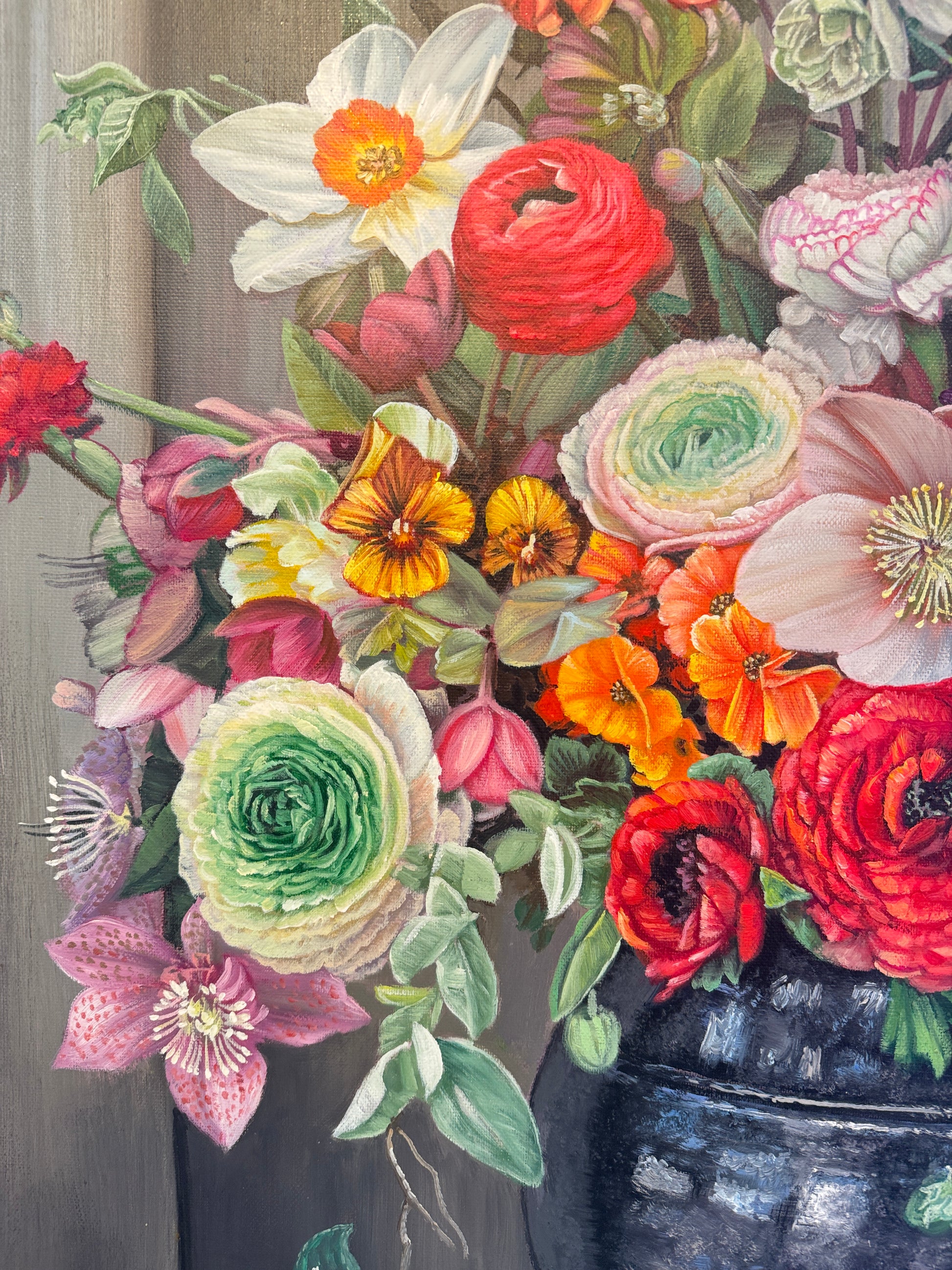 This is a beautiful oil painting of an array of flowers in a vase. Contemporary painting full of details and colors, vibrant roses , tulips, peonies and an arrangement of other flowers. Reminding us of old master paintings, this is a brand new painting full elegance and timeless elegance.