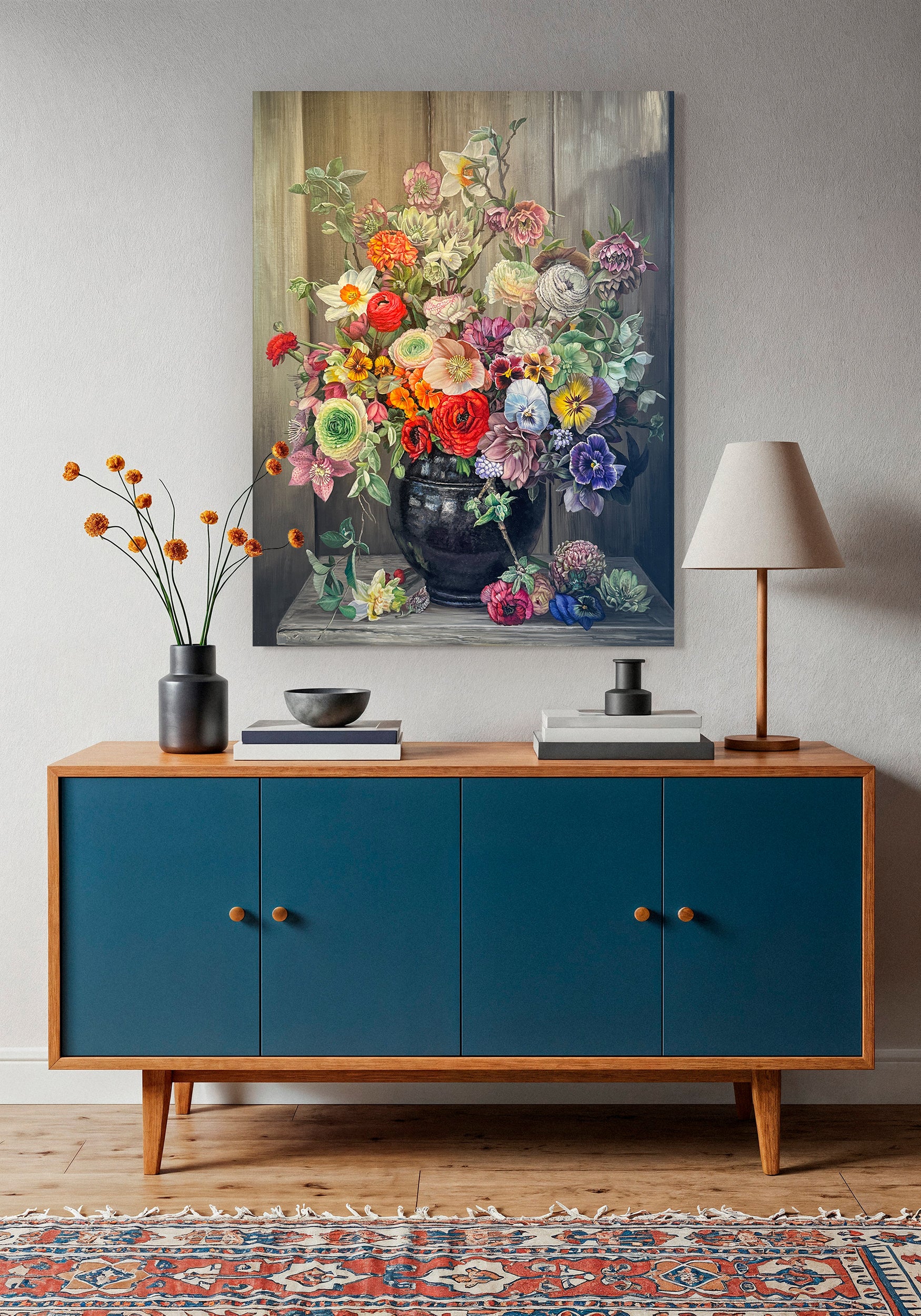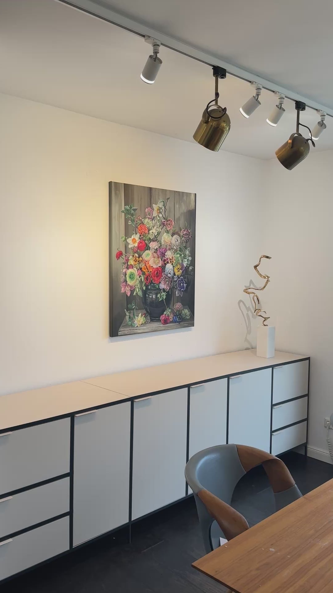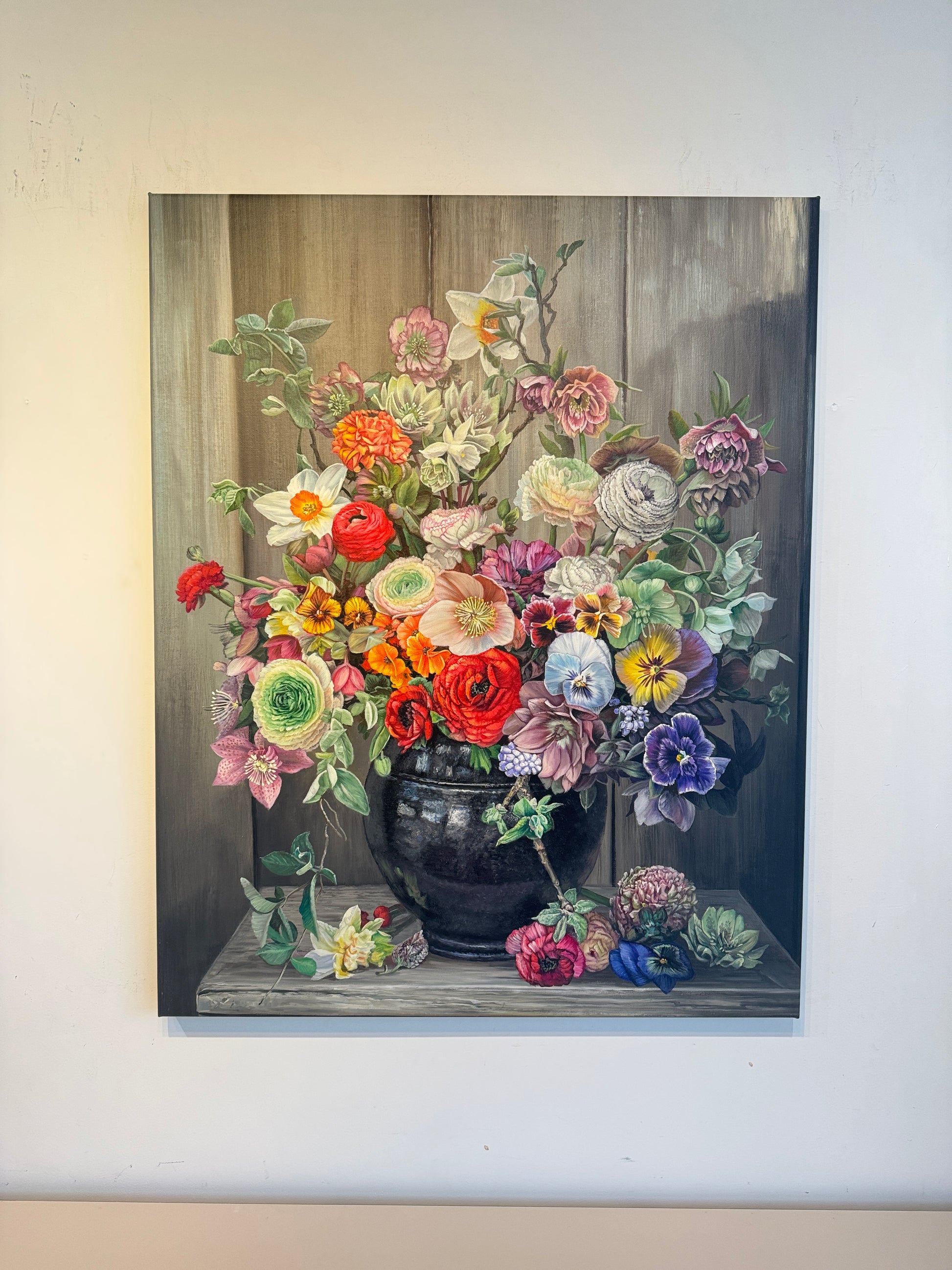 This is a beautiful oil painting of an array of flowers in a vase. Contemporary painting full of details and colors, vibrant roses , tulips, peonies and an arrangement of other flowers. Reminding us of old master paintings, this is a brand new painting full elegance and timeless elegance.
