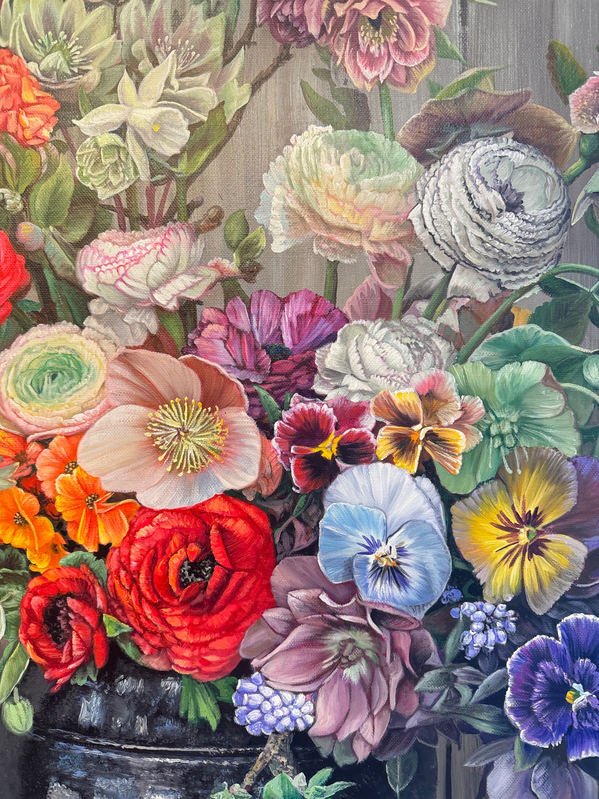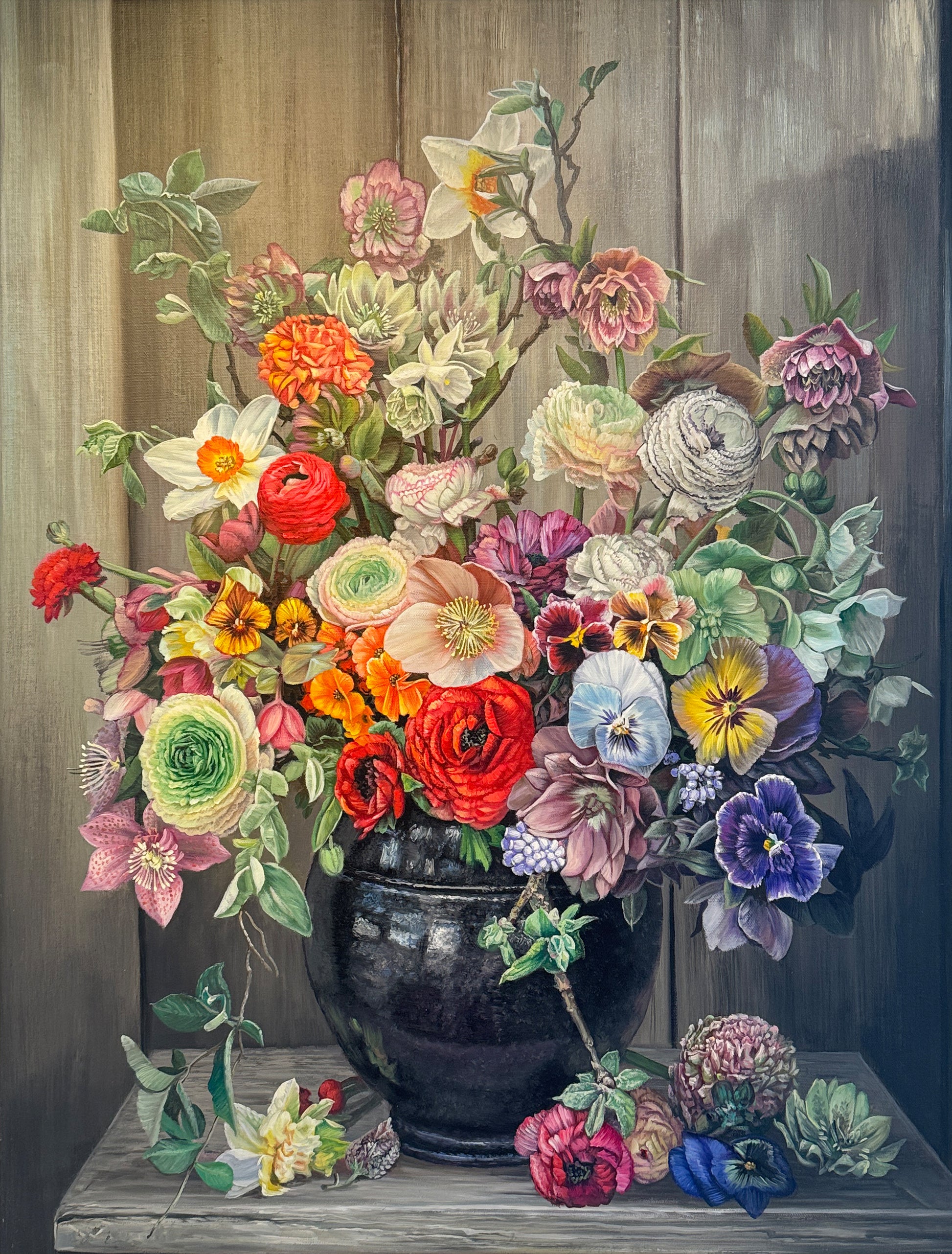 Husslein's artistic philosophy marries a reverence for classical masterpieces with the immersive allure of contemporary still life and botany. Her signature style is characterized by meticulous hyperrealism, particularly evident in her still-life floral compositions. Central to her creations are the visual and tactile attributes of flowers, intertwined with their symbolism evoking themes of love, femininity, and the natural world. These elements coalesce to fashion Husslein's vivacious and captivating compositions.