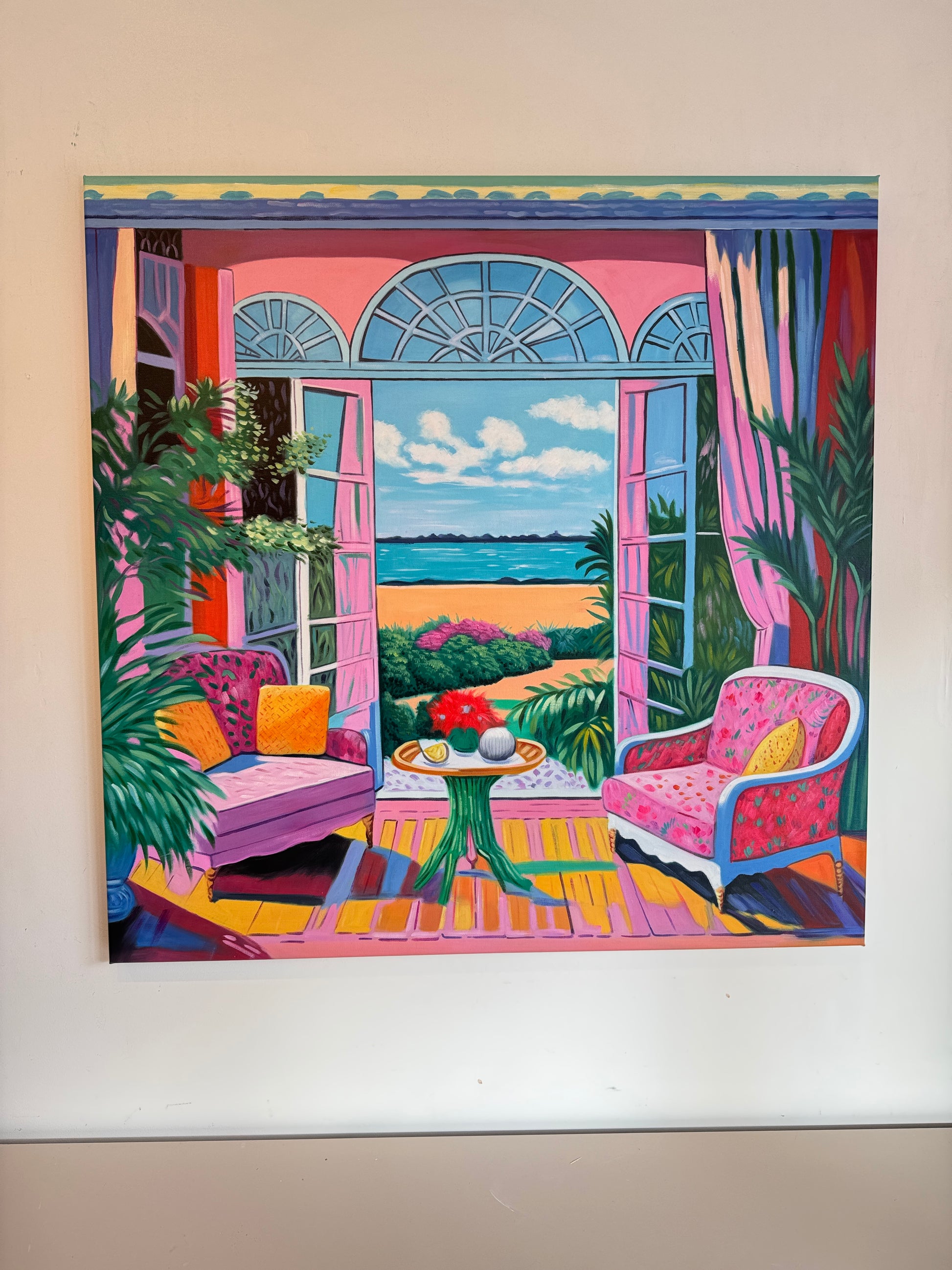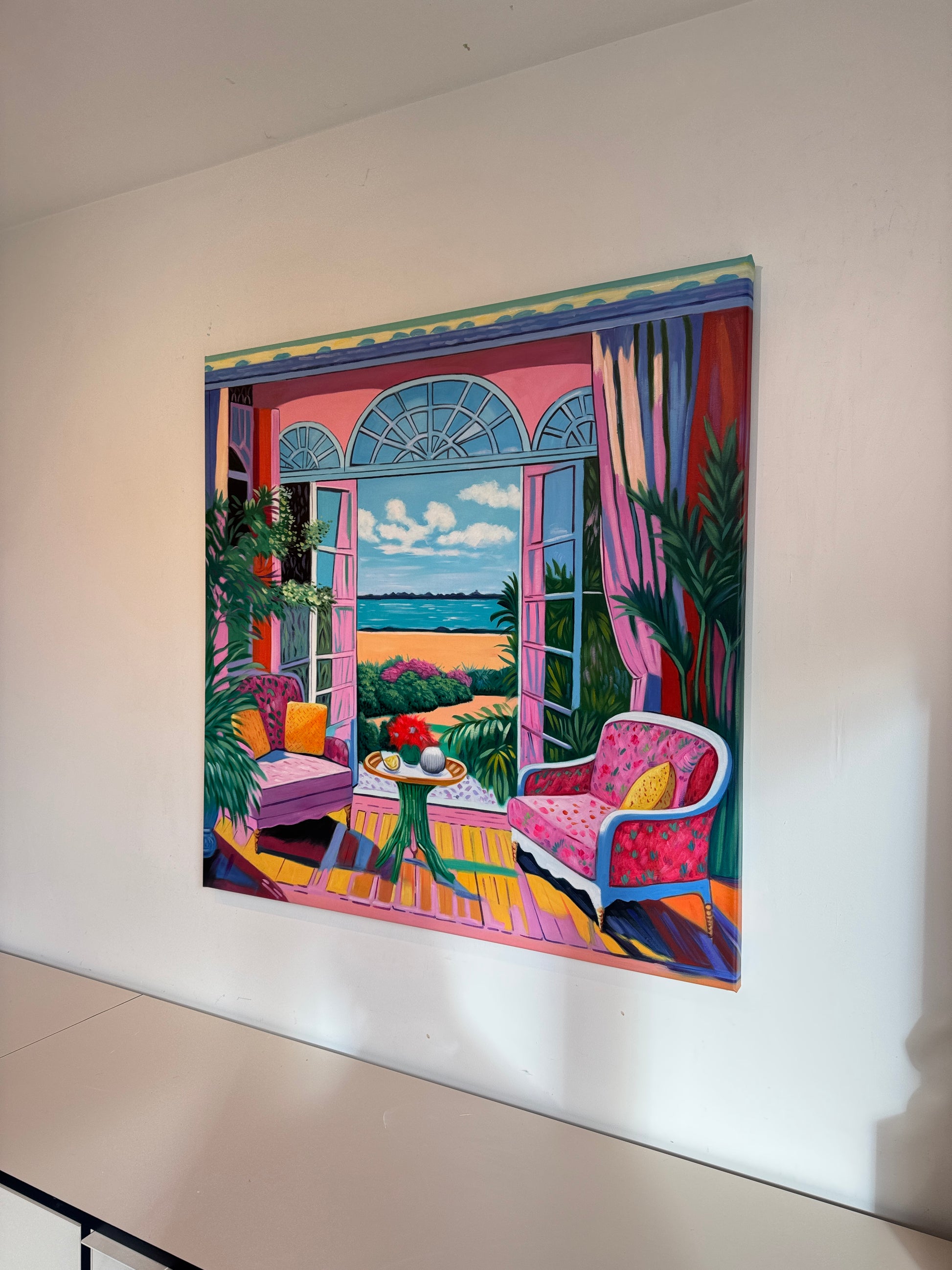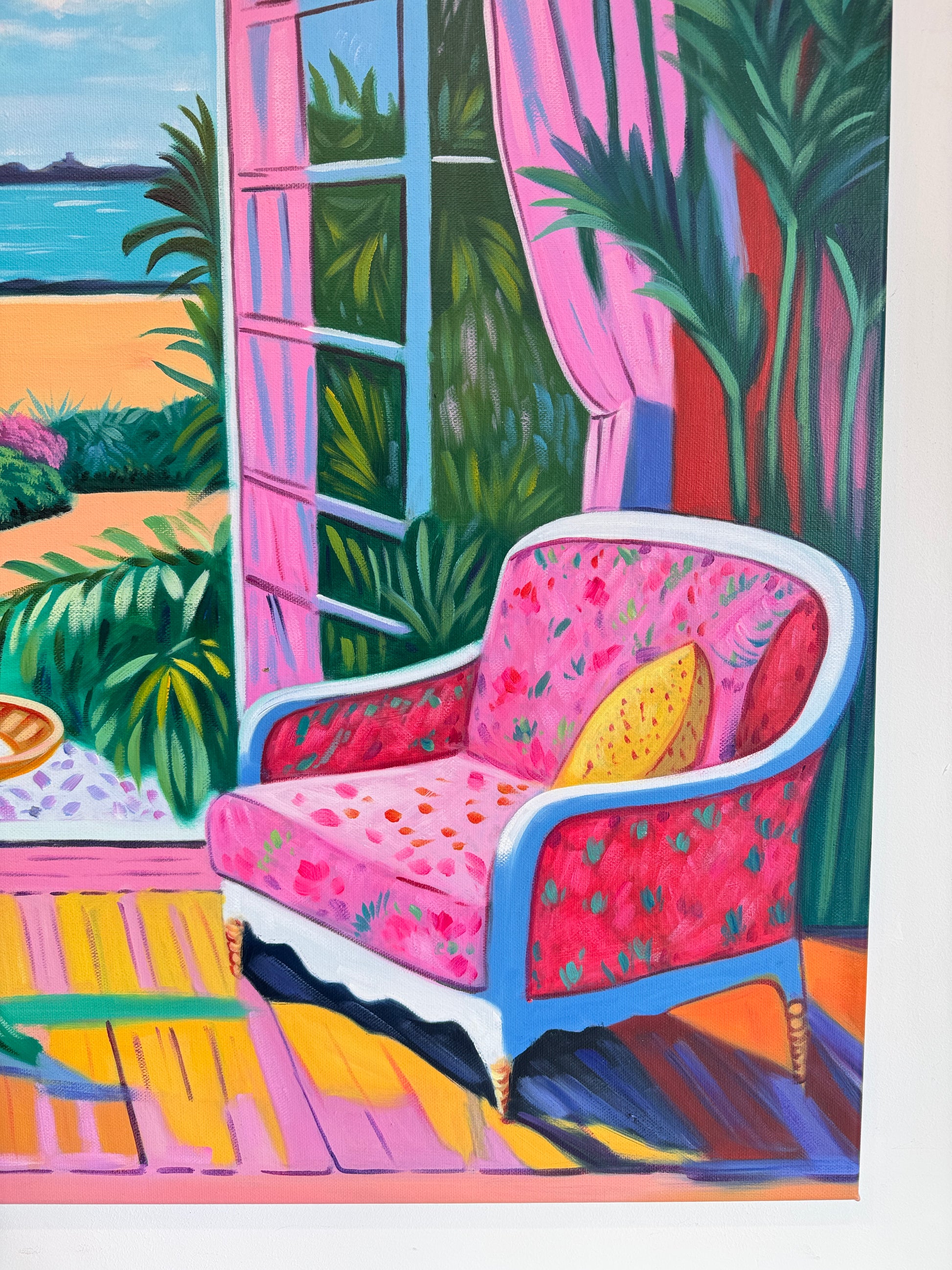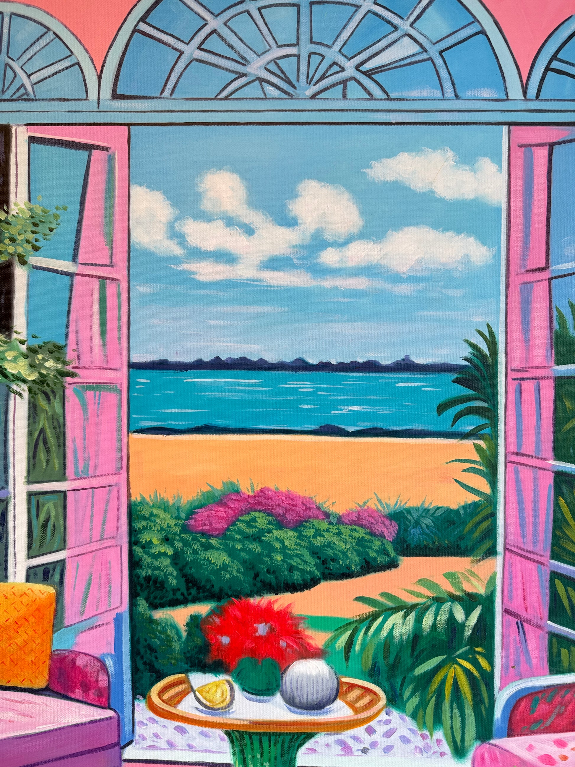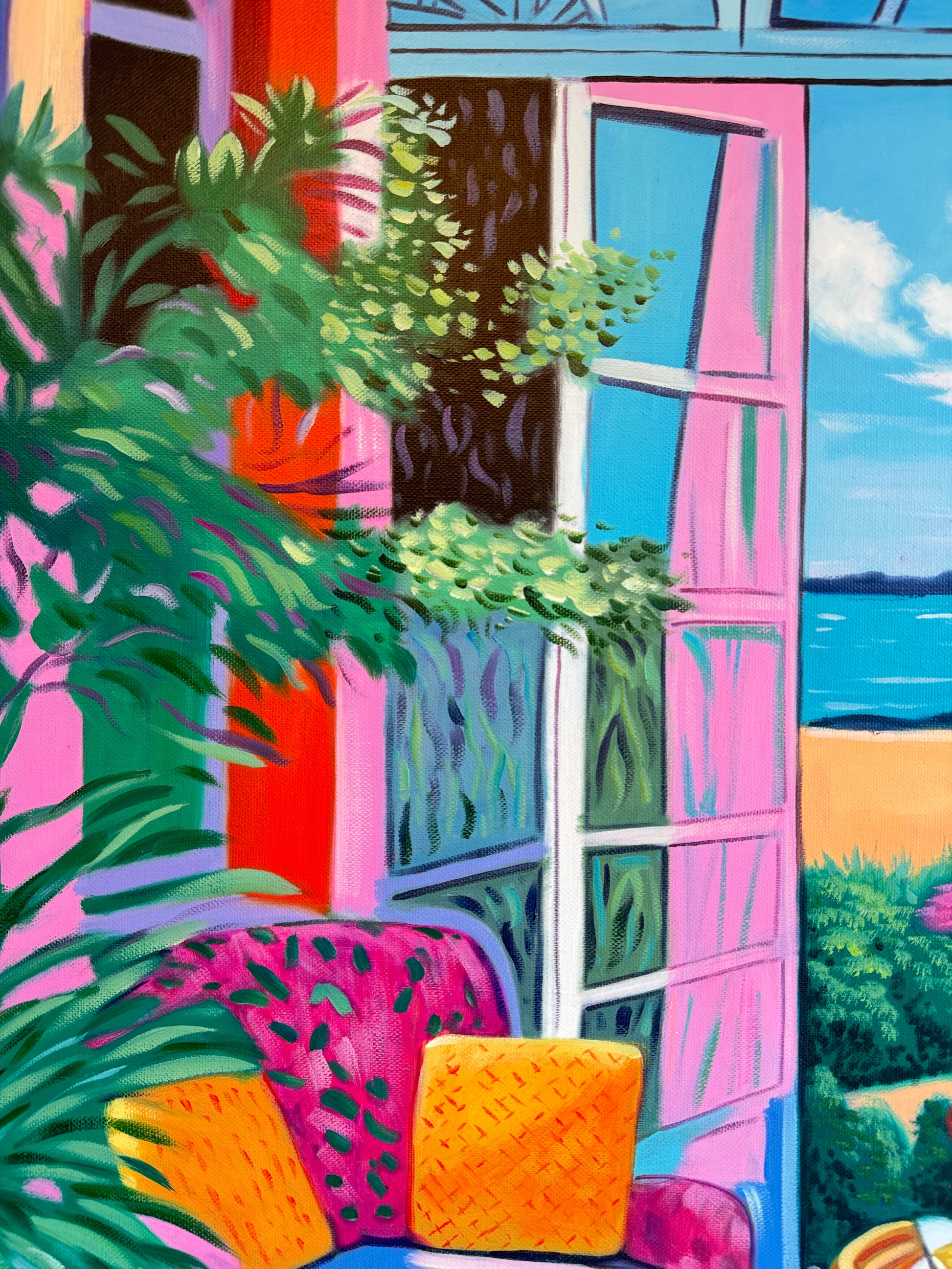 With bold colours, soft light, and breezy compositions, the paintings capture the laid-back rhythm of holiday life. Added thread details, carefully stitched into the canvas, highlight small elements and bring a subtle, tactile layer to the work — adding intimacy and depth without overpowering the calm, open feel of each piece.