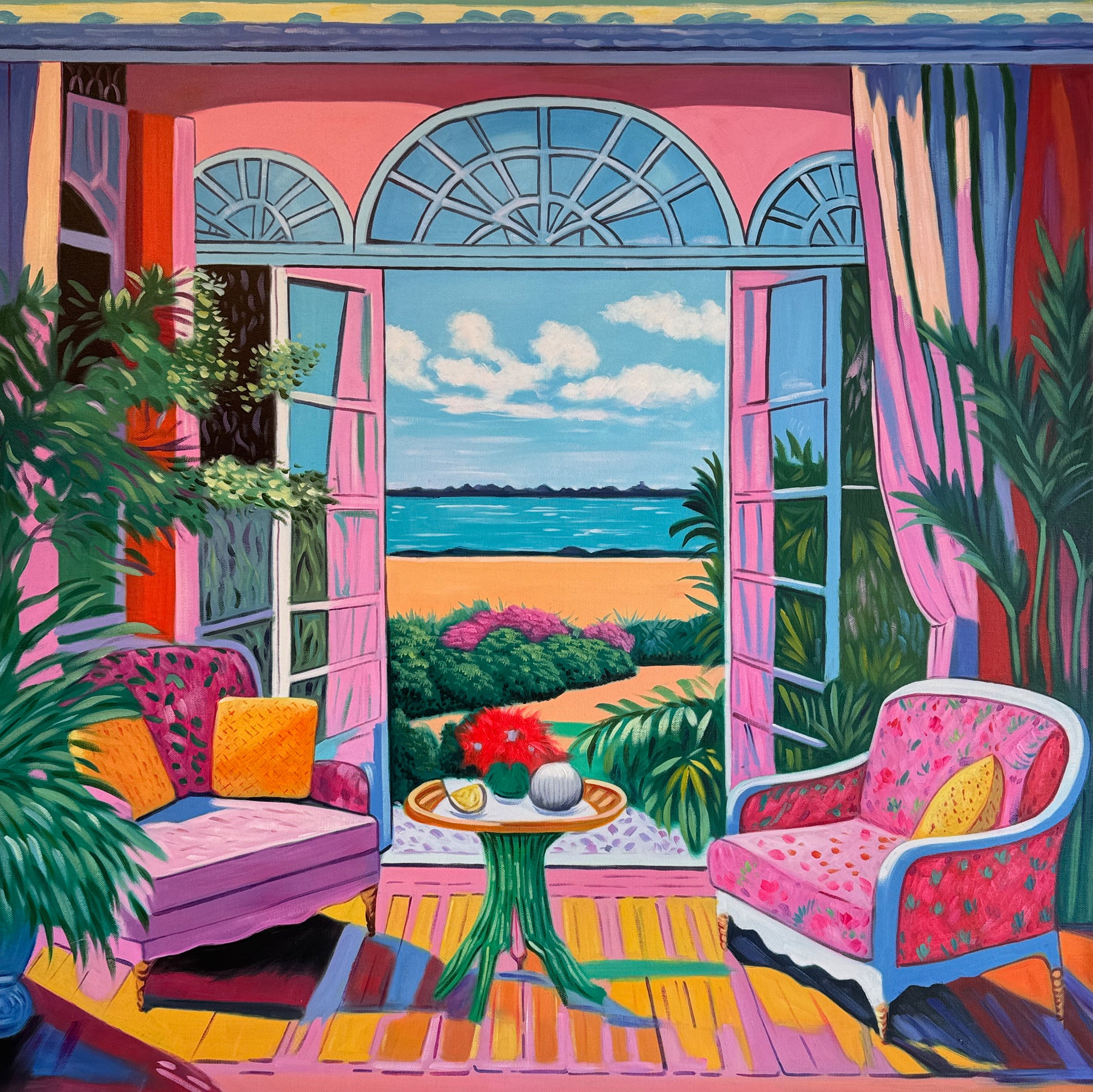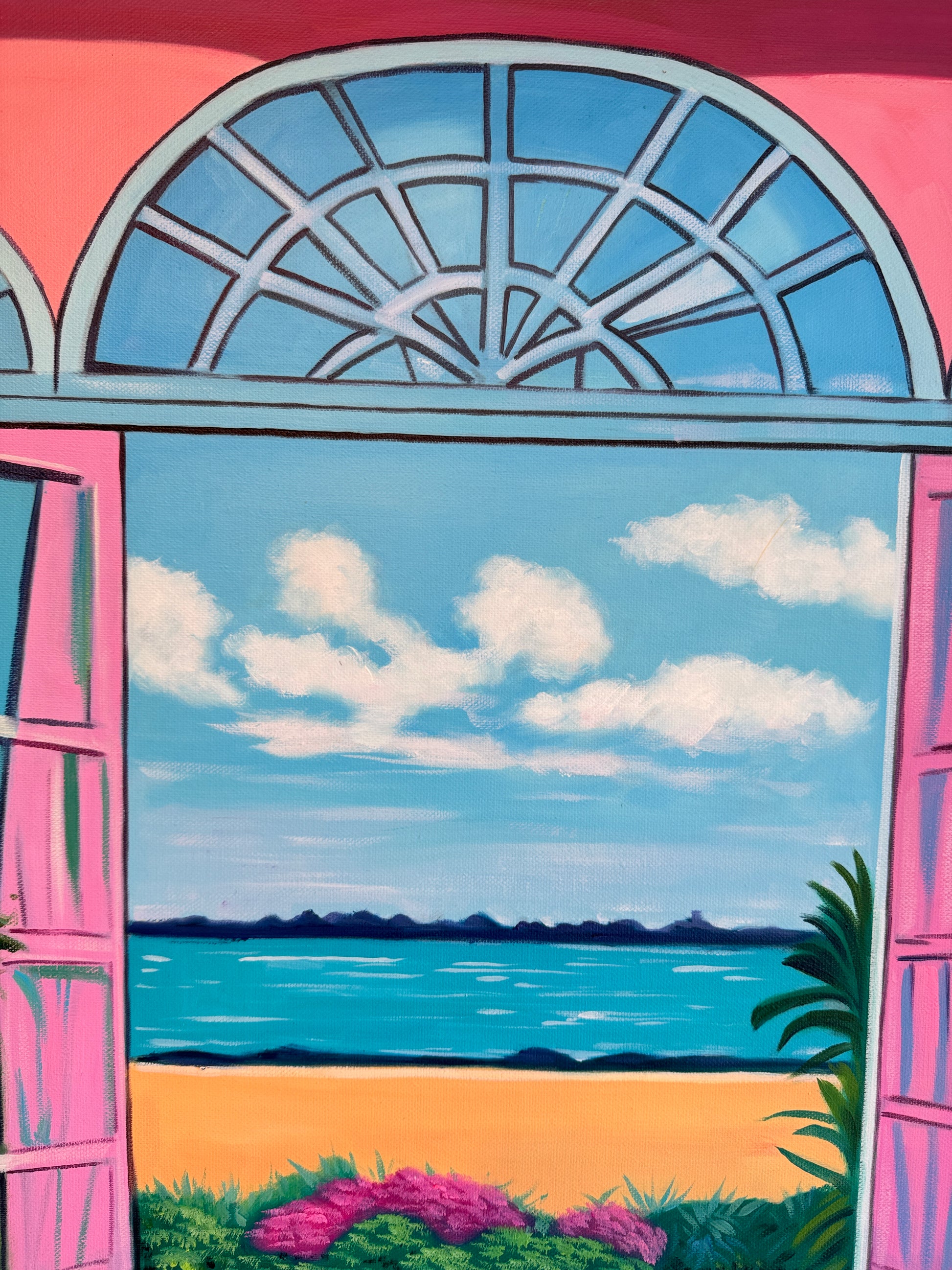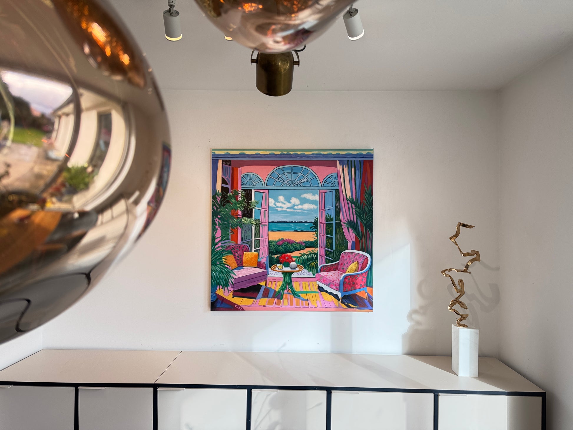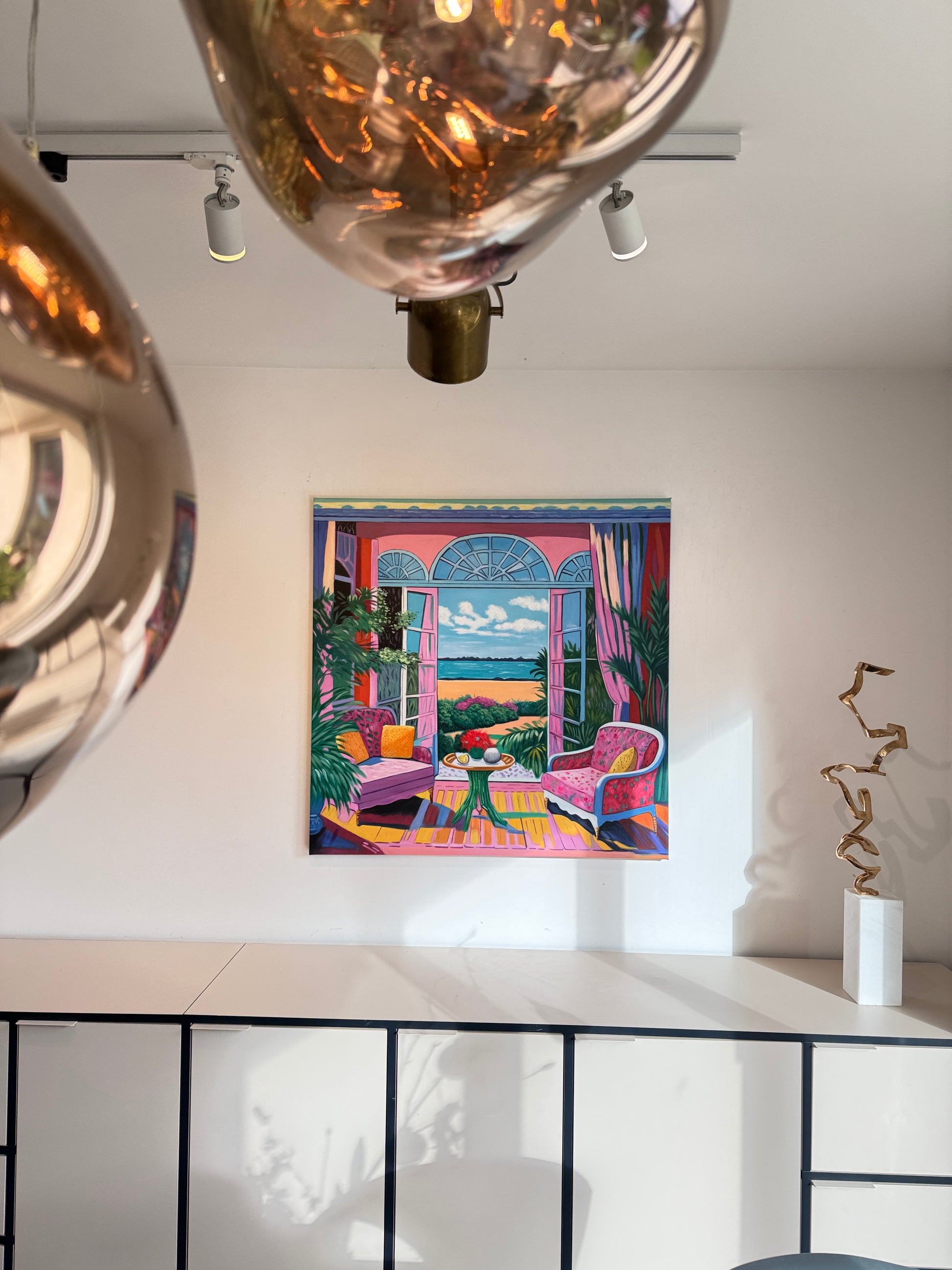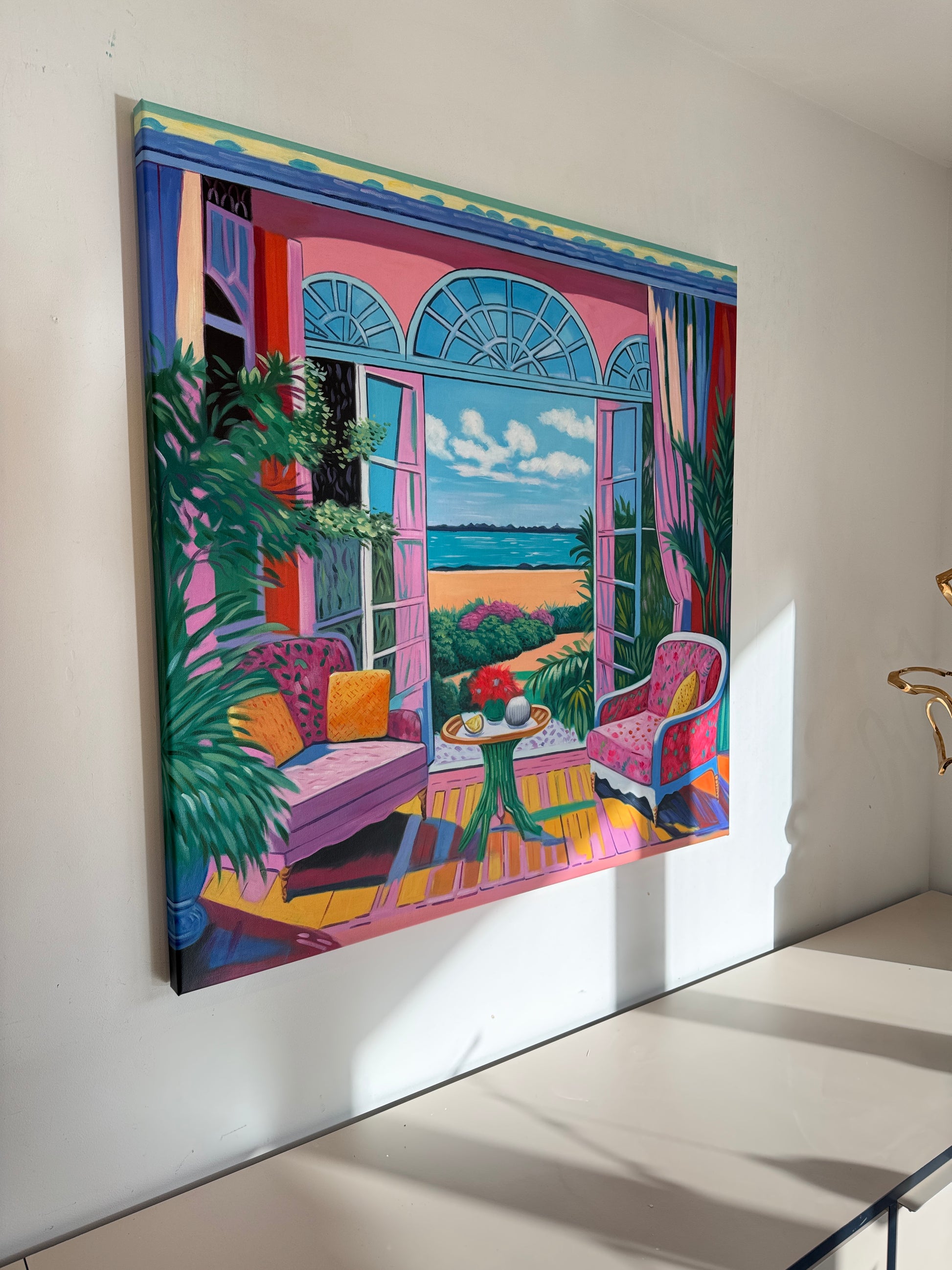 With bold colours, soft light, and breezy compositions, the paintings capture the laid-back rhythm of holiday life. Added thread details, carefully stitched into the canvas, highlight small elements and bring a subtle, tactile layer to the work — adding intimacy and depth without overpowering the calm, open feel of each piece.