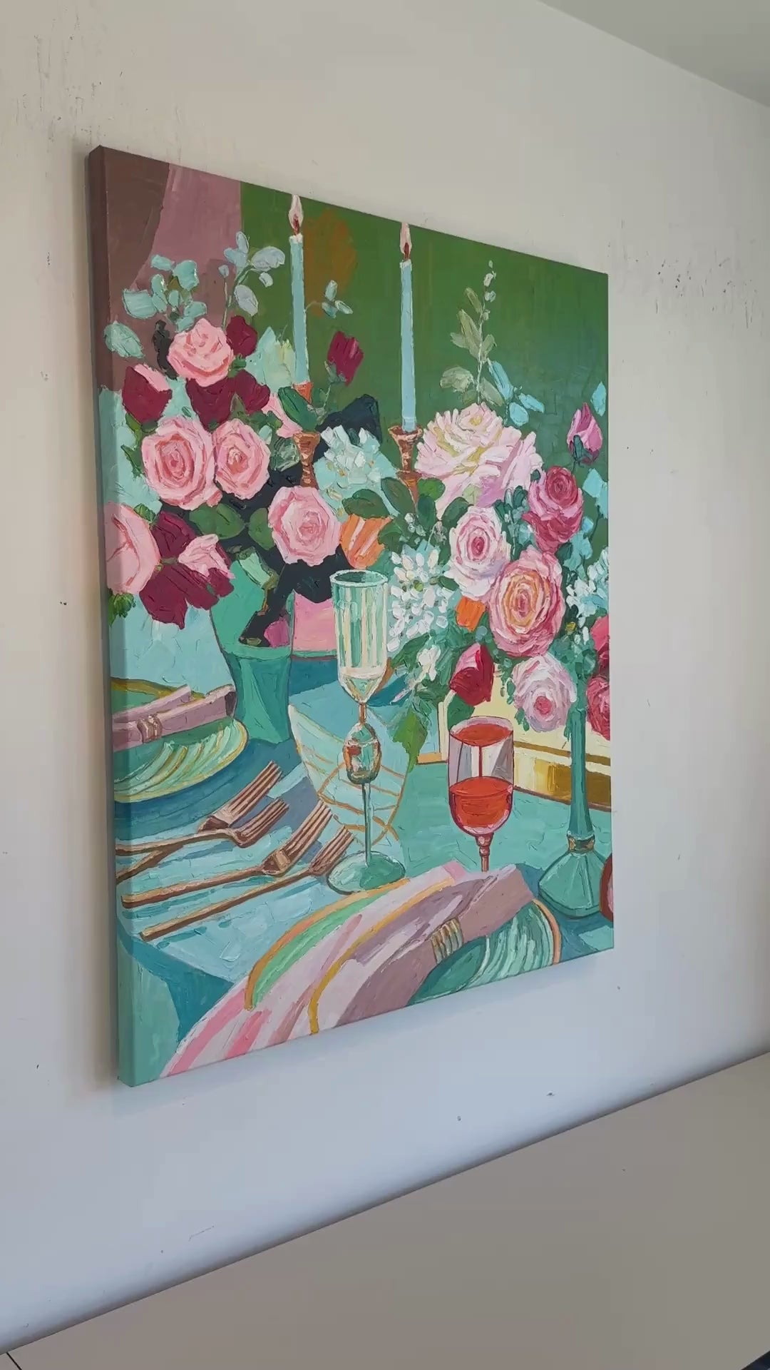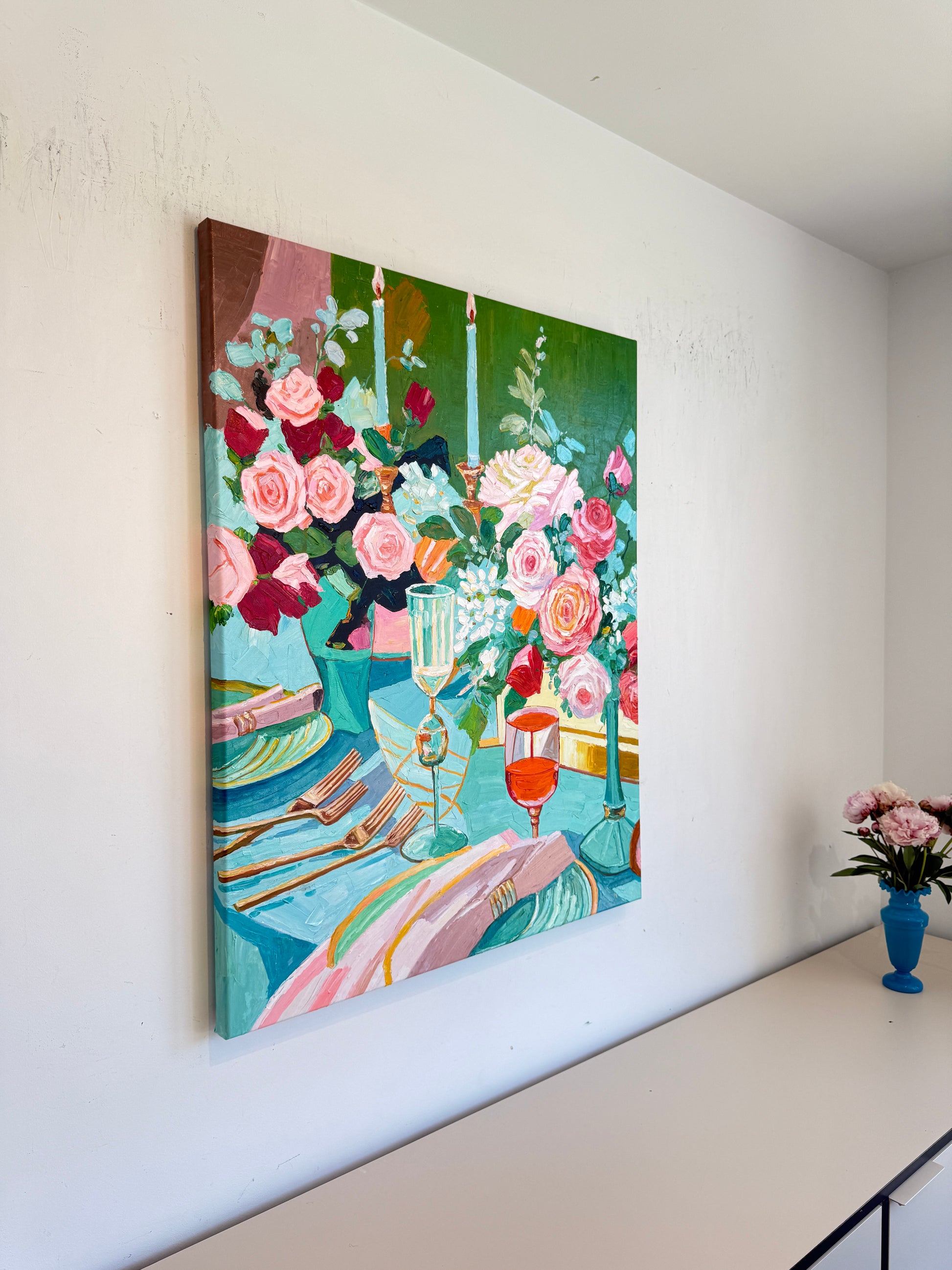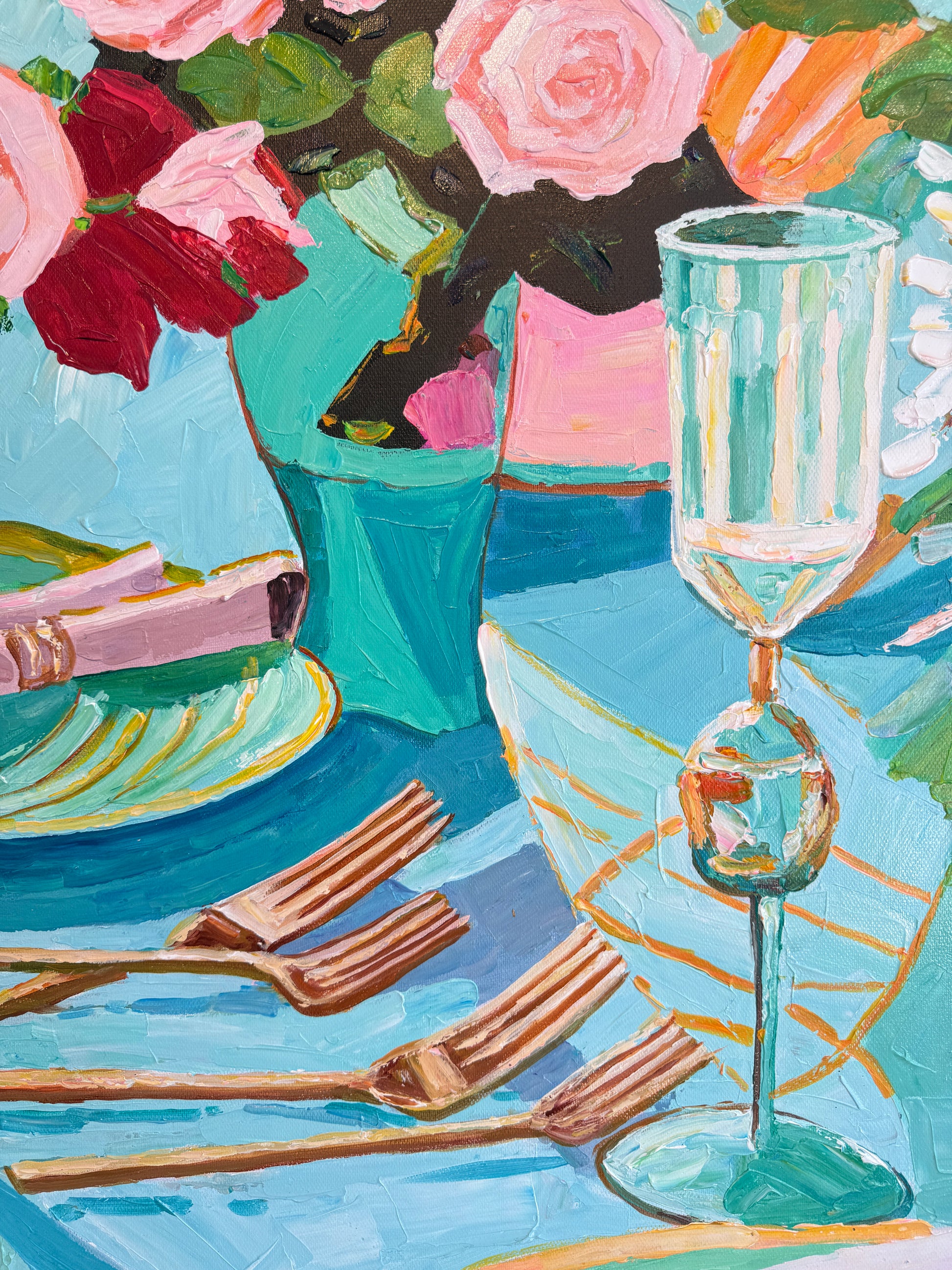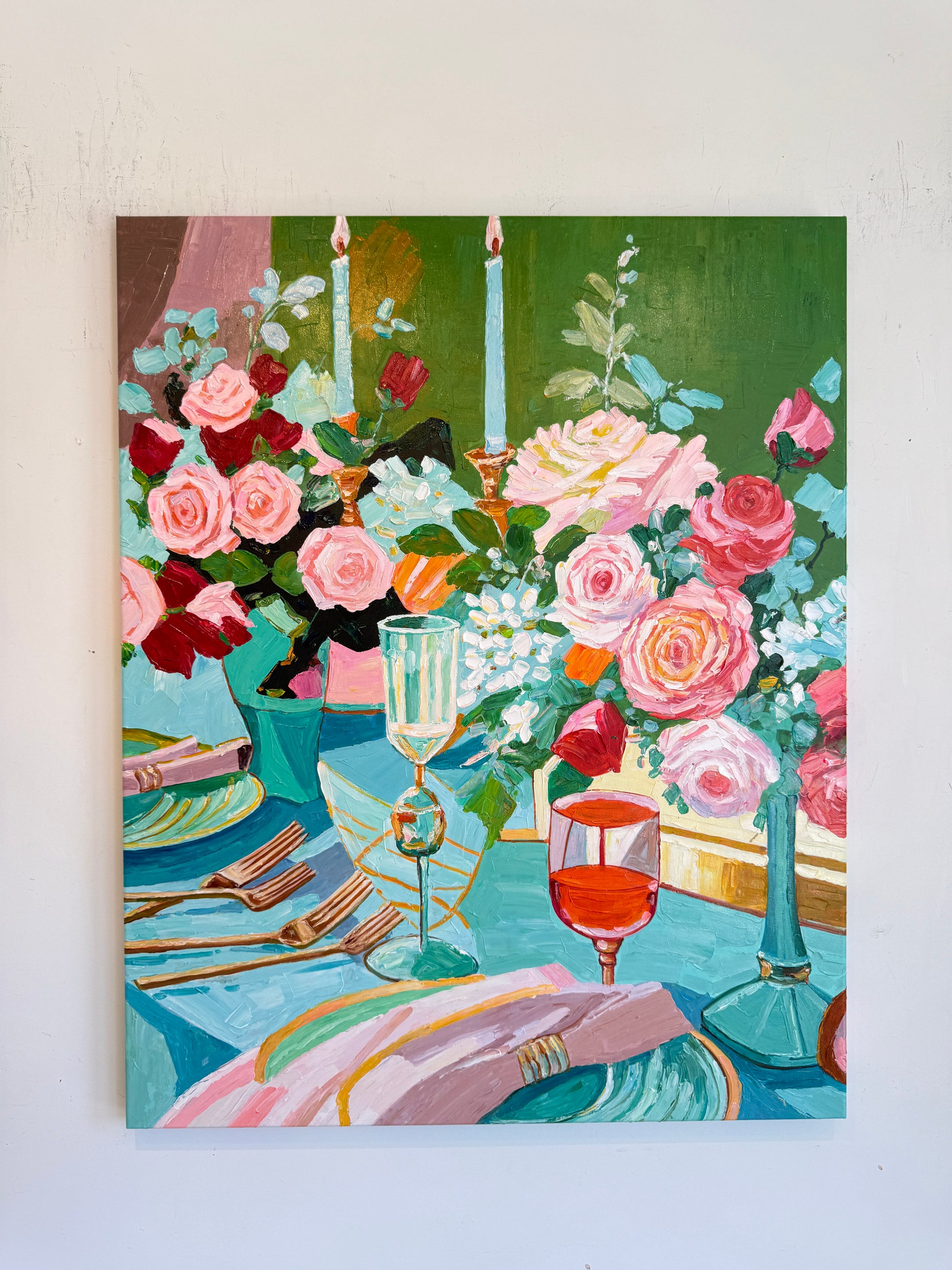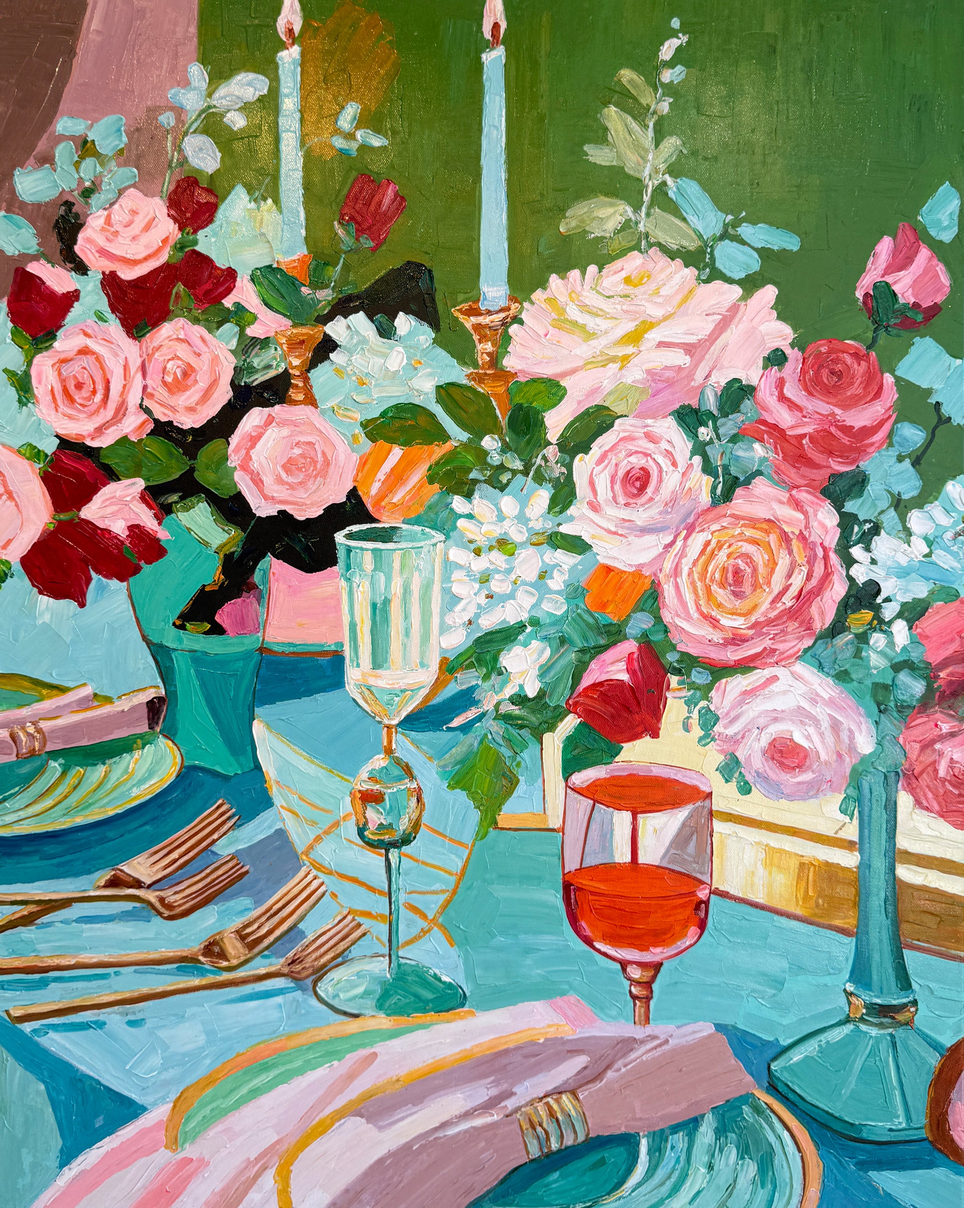 Through bold brushwork and thick, sculptural layers of oil paint, she captures the essence of fleeting moments — the gleam of cutlery, the spill of wine, the quiet aftermath of a gathering. This series diverges from her more polished, historically influenced floral still lifes, embracing a raw, tactile approach that elevates the ordinary into the extraordinary.