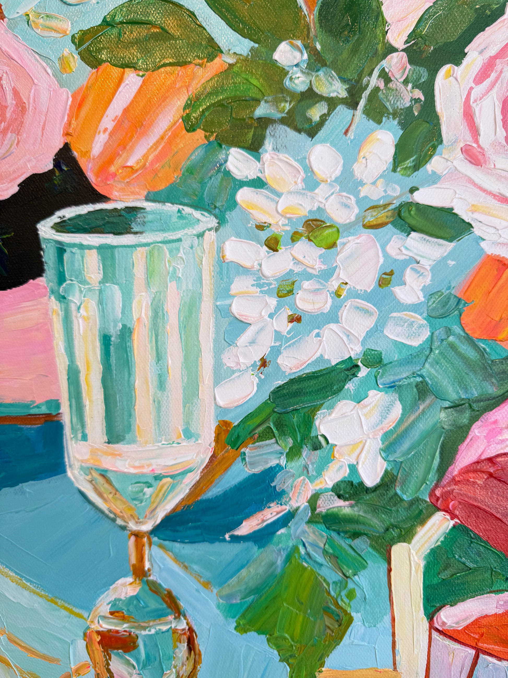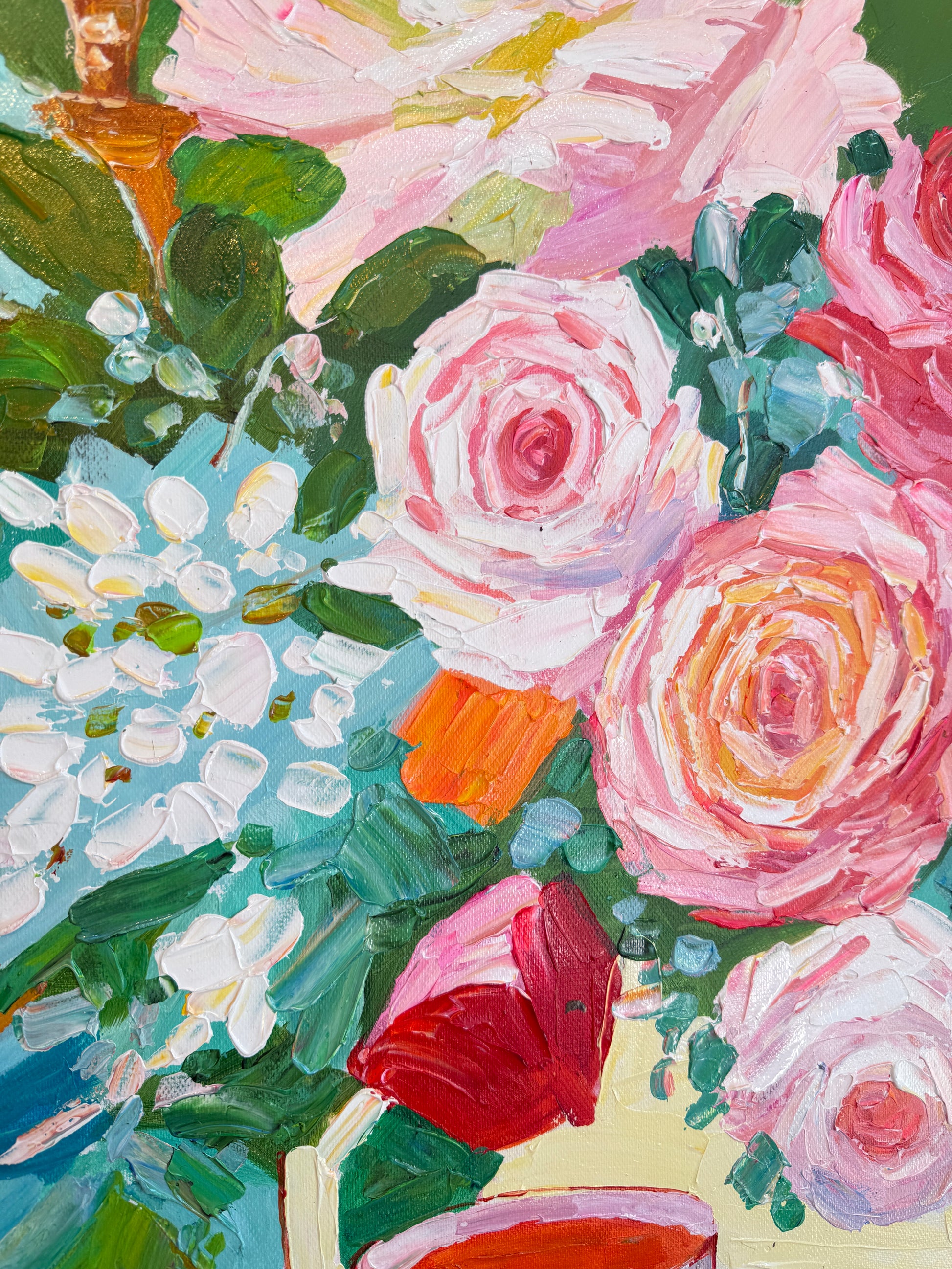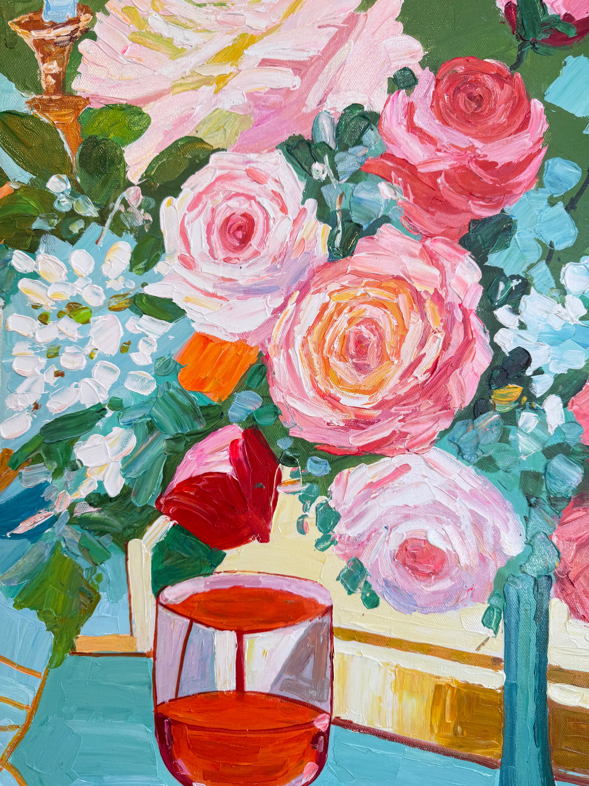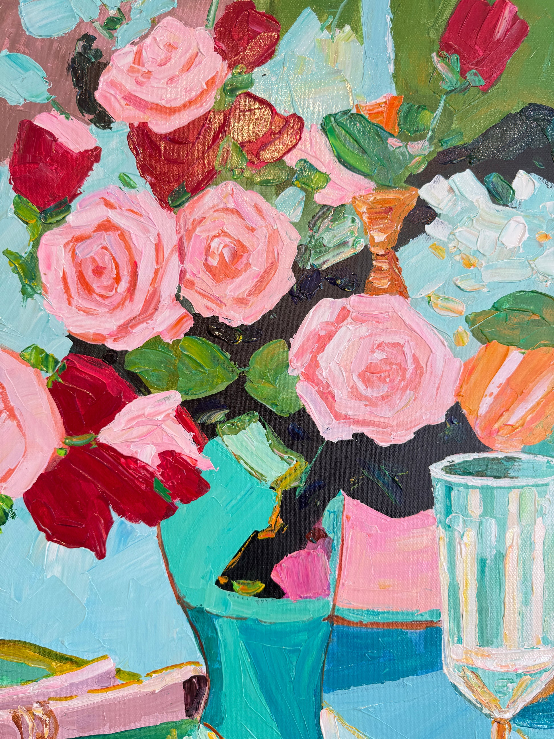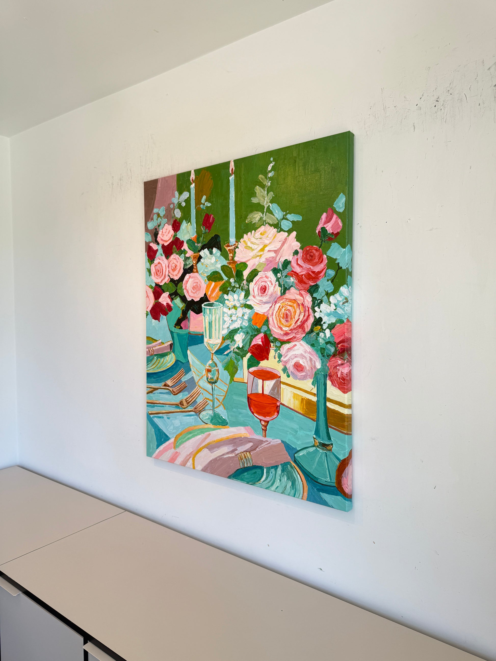 Through bold brushwork and thick, sculptural layers of oil paint, she captures the essence of fleeting moments — the gleam of cutlery, the spill of wine, the quiet aftermath of a gathering. This series diverges from her more polished, historically influenced floral still lifes, embracing a raw, tactile approach that elevates the ordinary into the extraordinary.