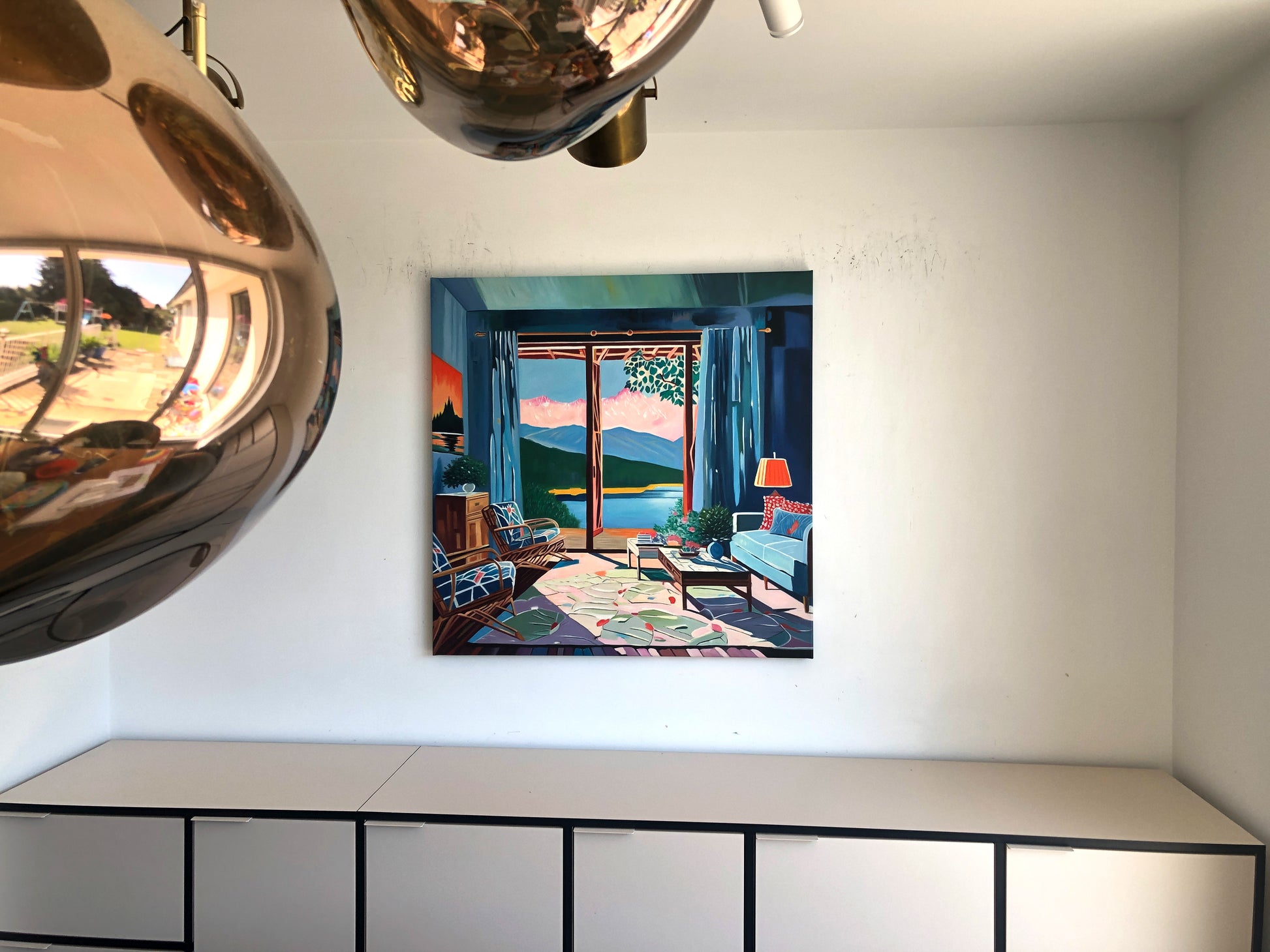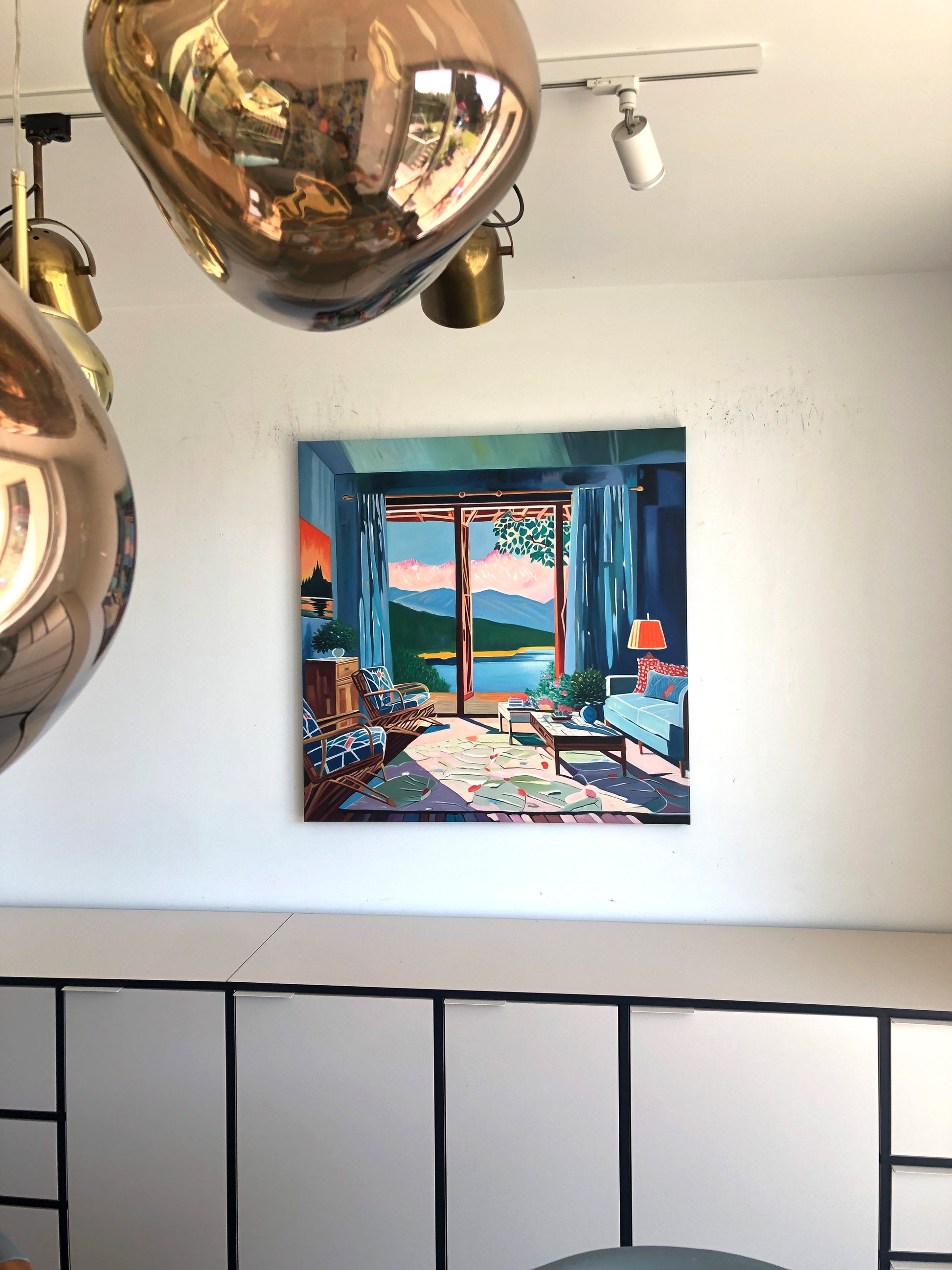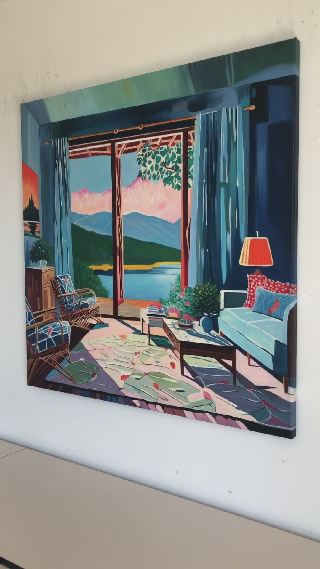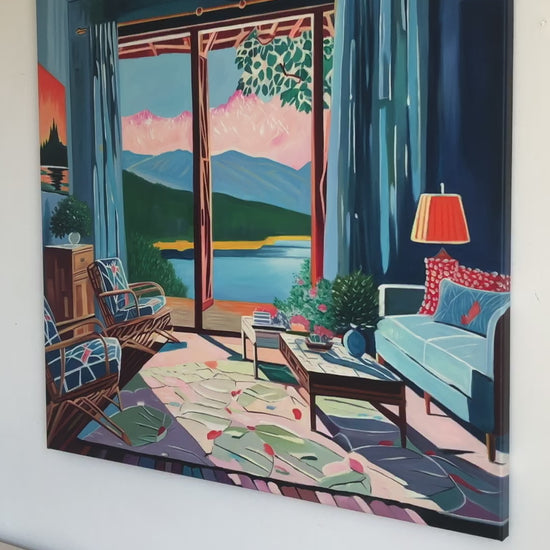 With bold colours, soft light, and breezy compositions, the paintings capture the laid-back rhythm of holiday life. Added thread details, carefully stitched into the canvas, highlight small elements and bring a subtle, tactile layer to the work — adding intimacy and depth without overpowering the calm, open feel of each piece.