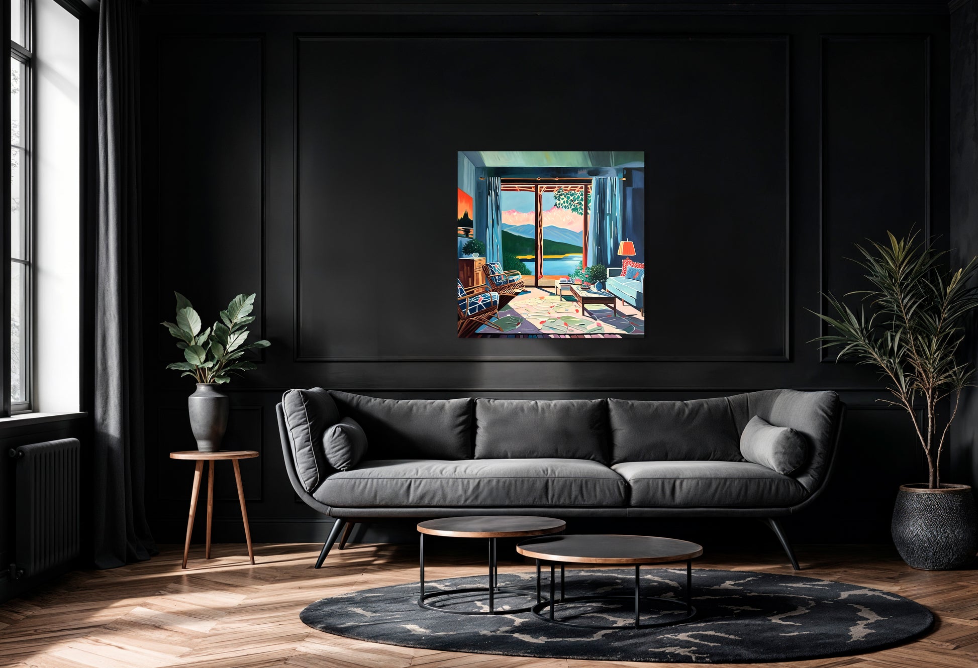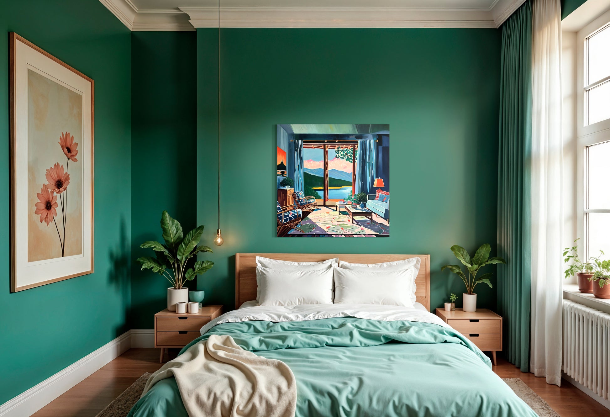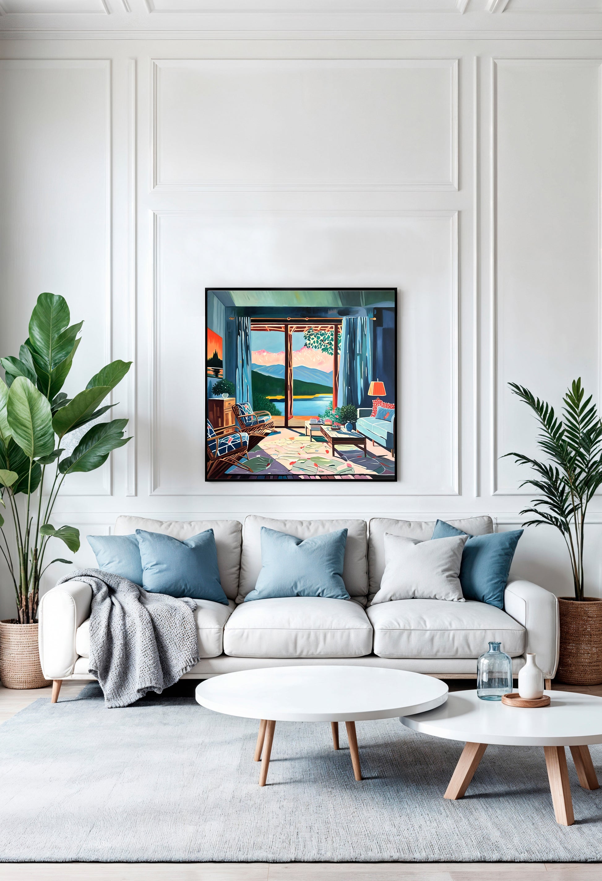 With bold colours, soft light, and breezy compositions, the paintings capture the laid-back rhythm of holiday life. Added thread details, carefully stitched into the canvas, highlight small elements and bring a subtle, tactile layer to the work — adding intimacy and depth without overpowering the calm, open feel of each piece.