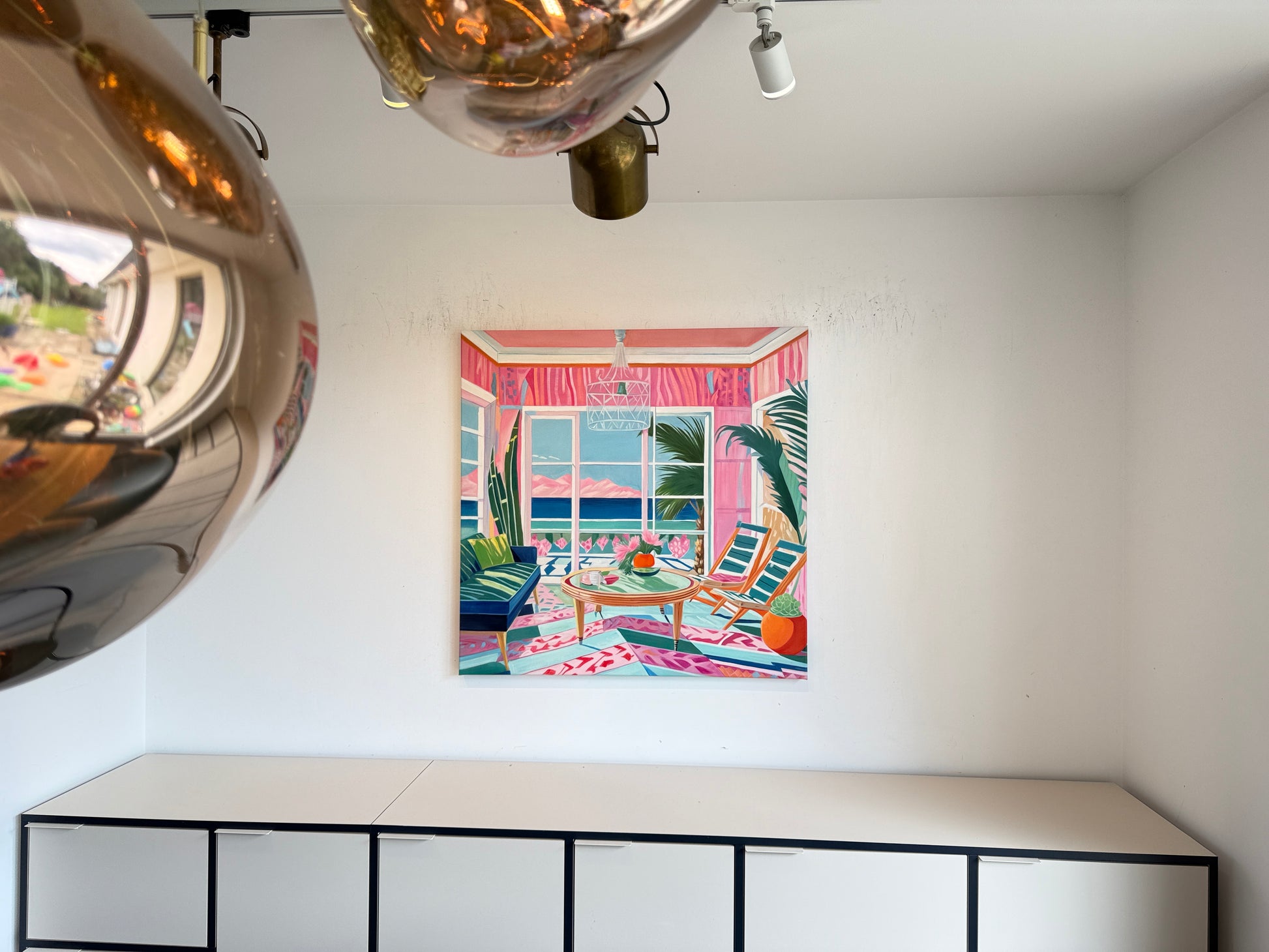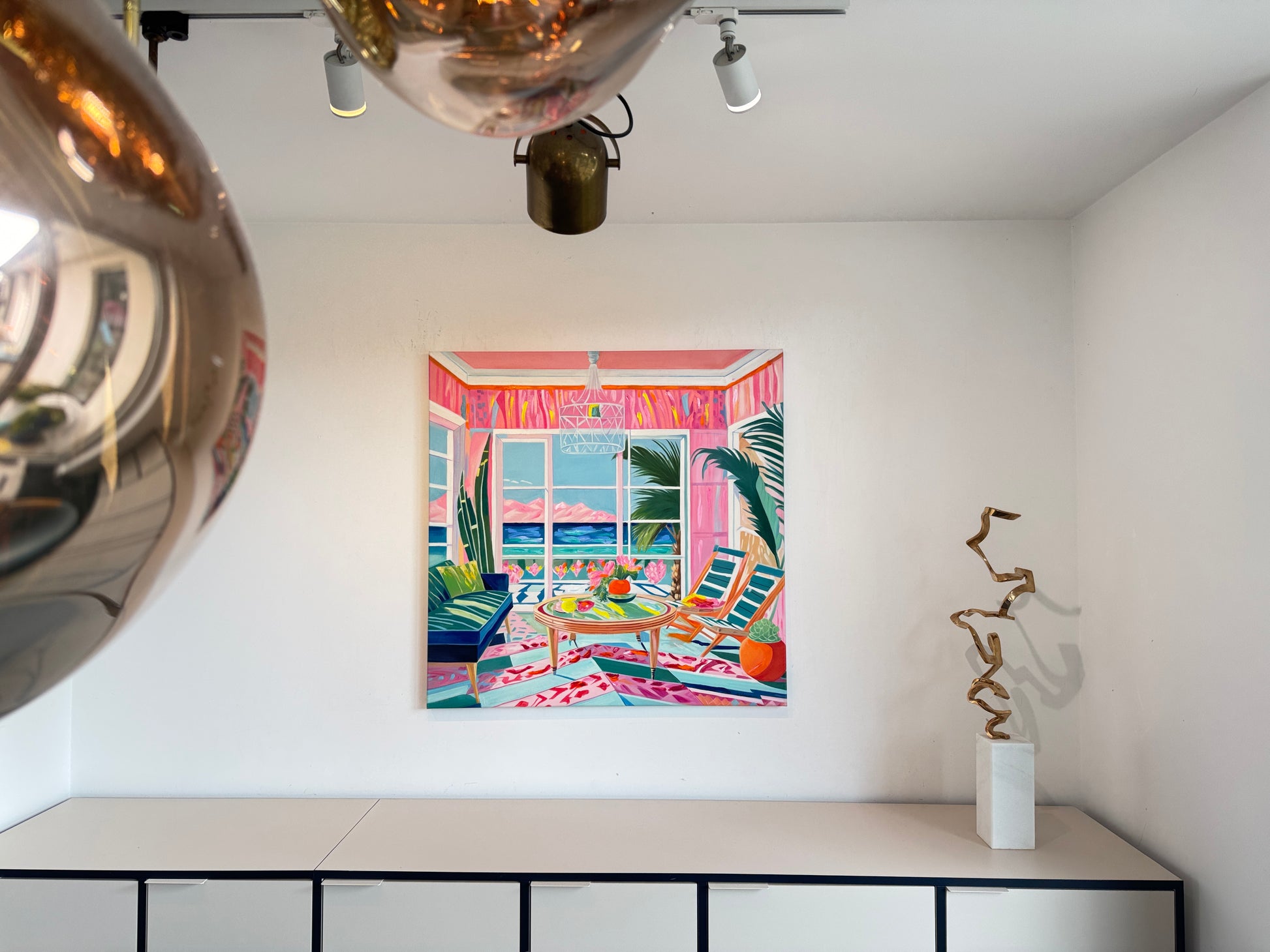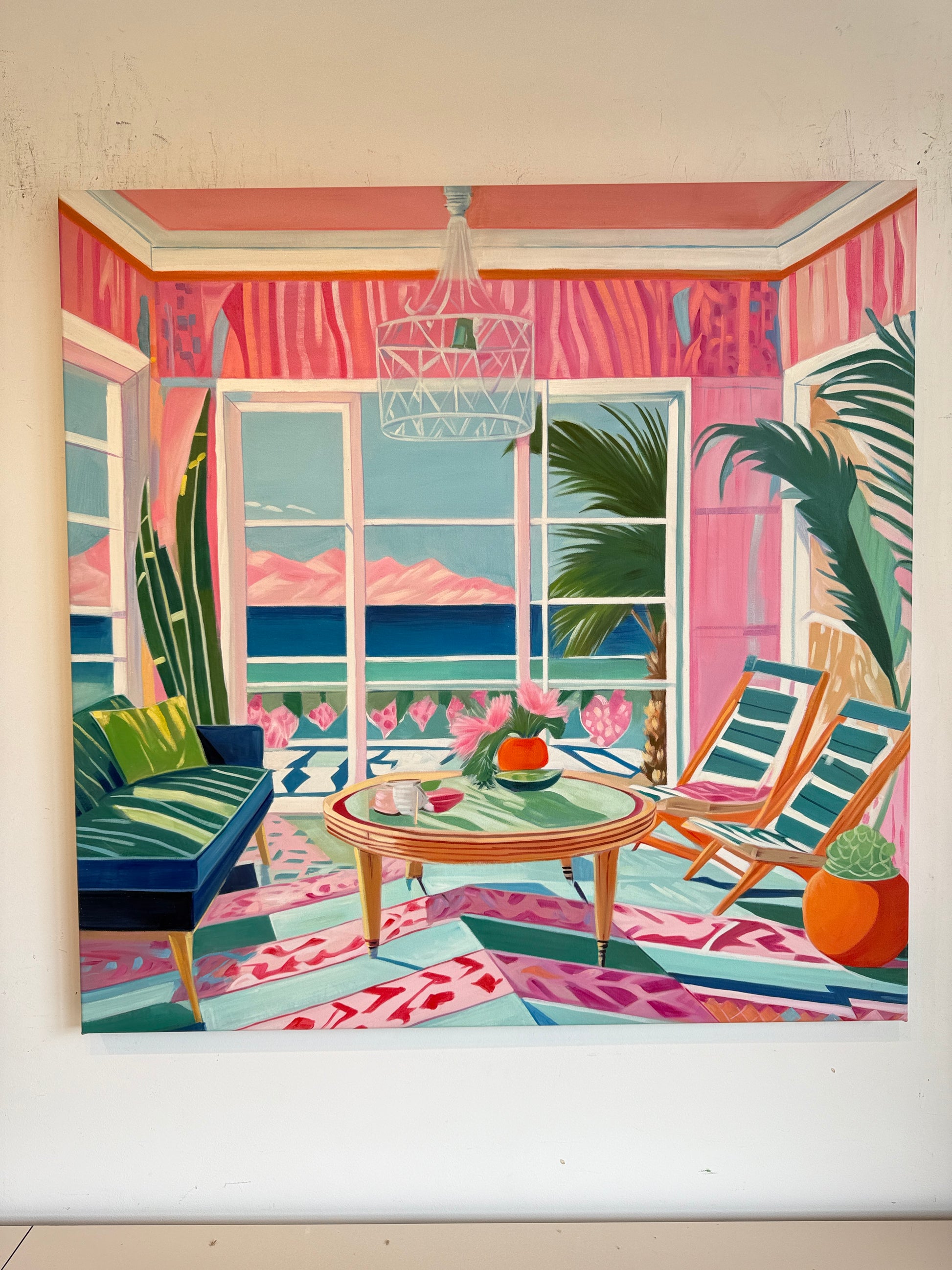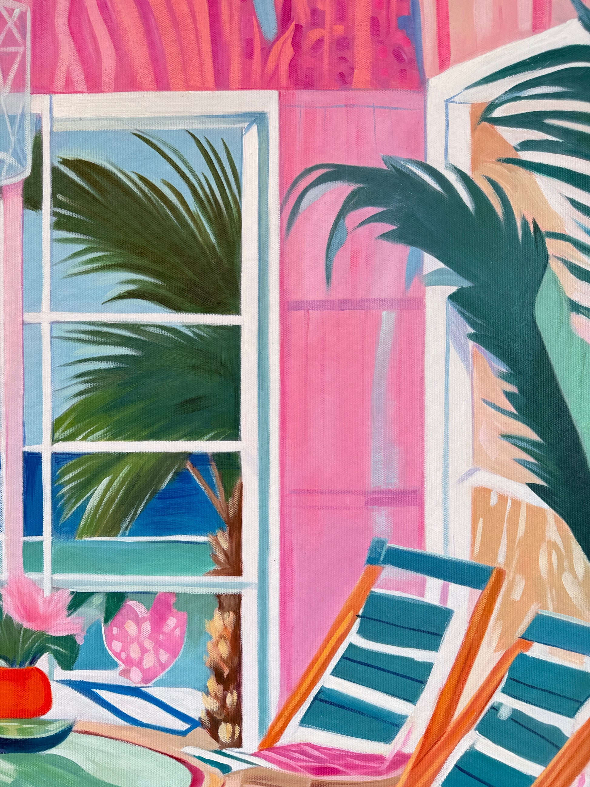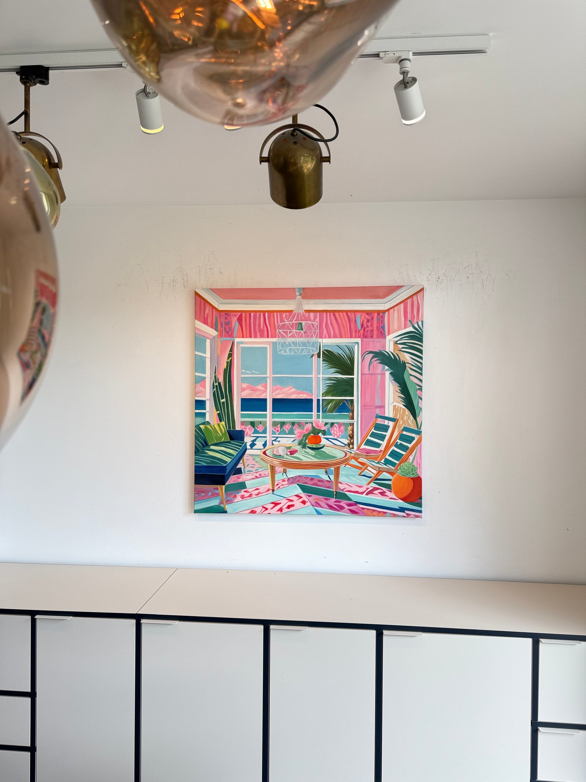 With bold colours, soft light, and breezy compositions, the paintings capture the laid-back rhythm of holiday life. Added thread details, carefully stitched into the canvas, highlight small elements and bring a subtle, tactile layer to the work — adding intimacy and depth without overpowering the calm, open feel of each piece.