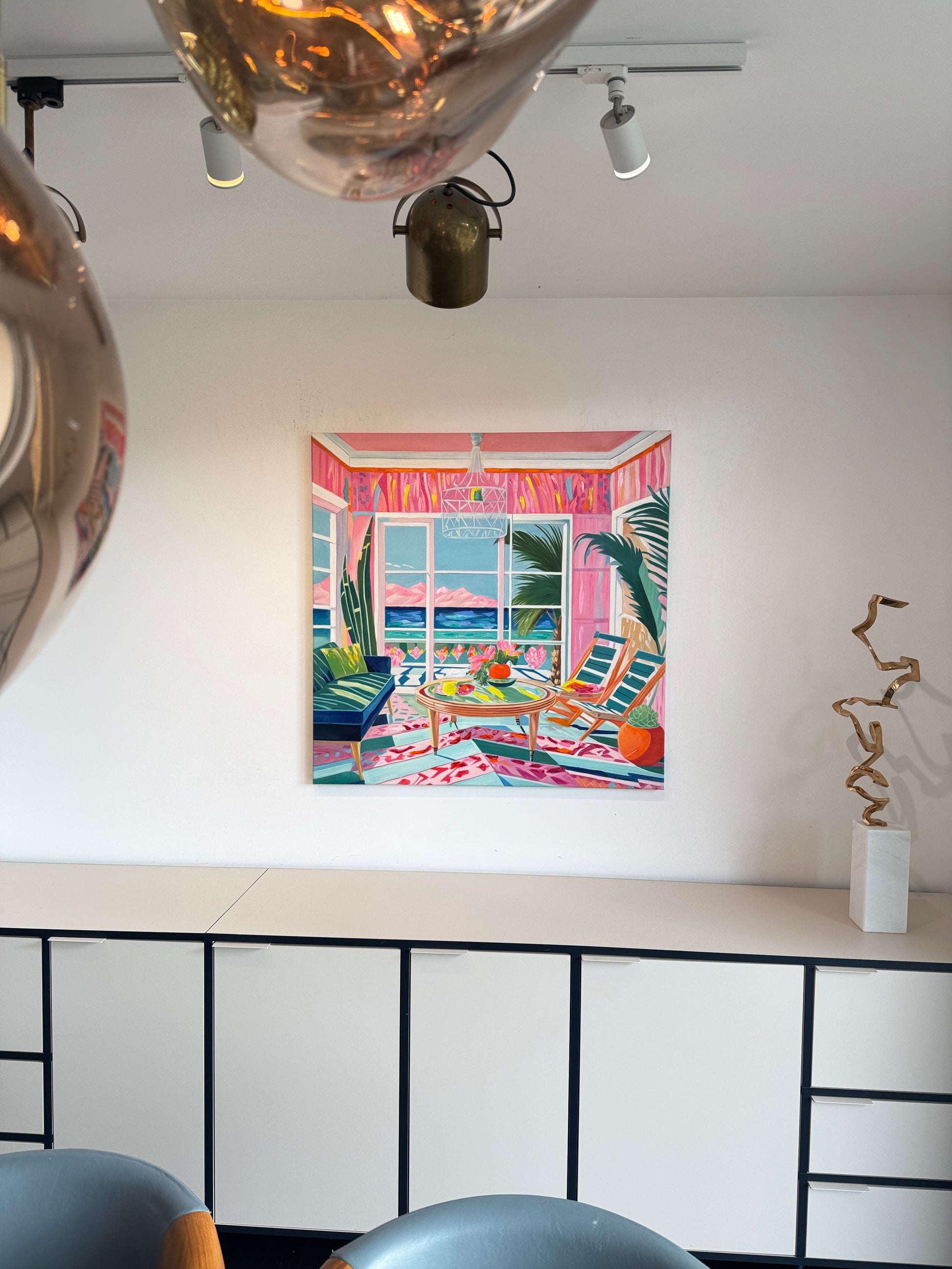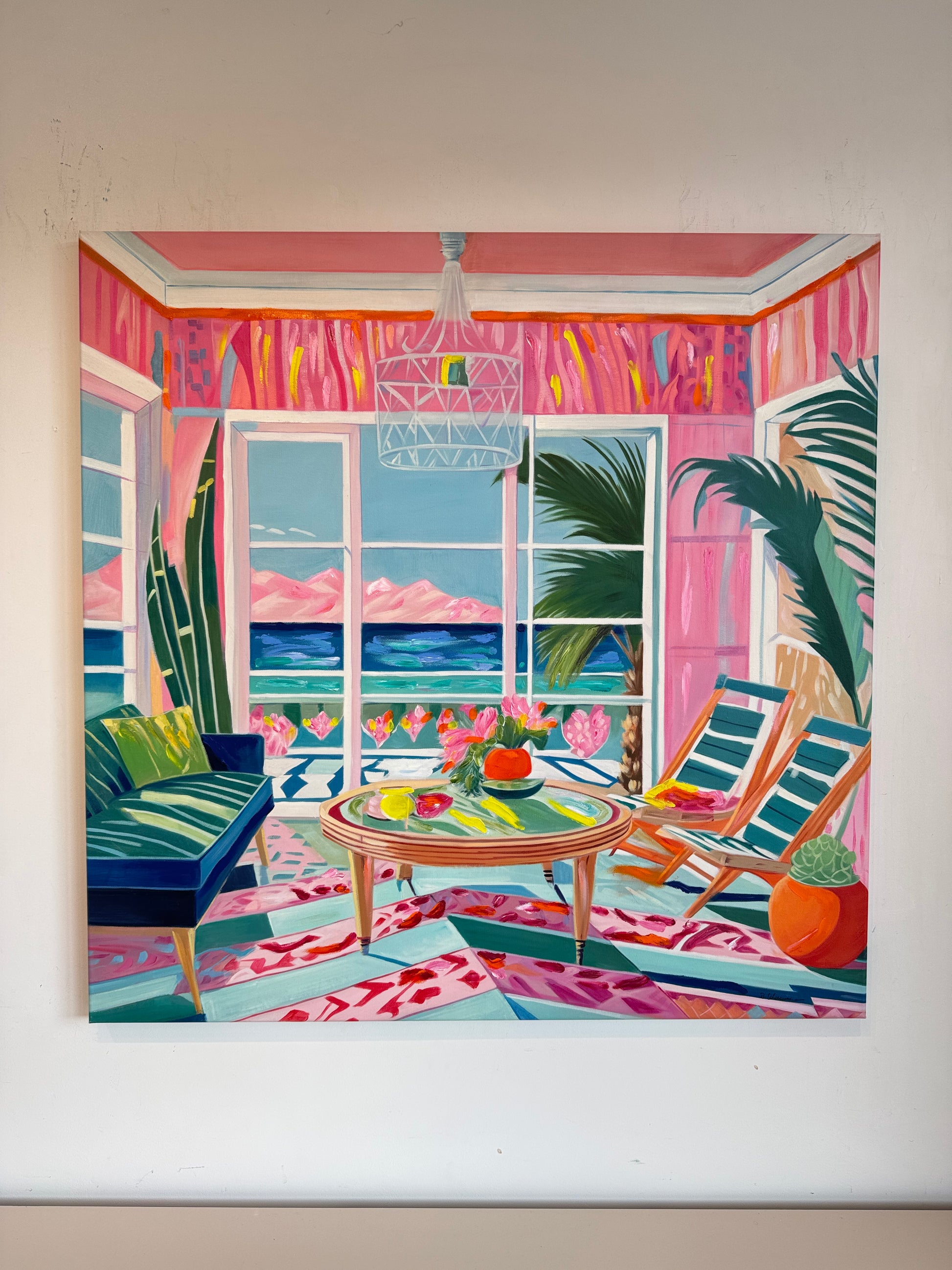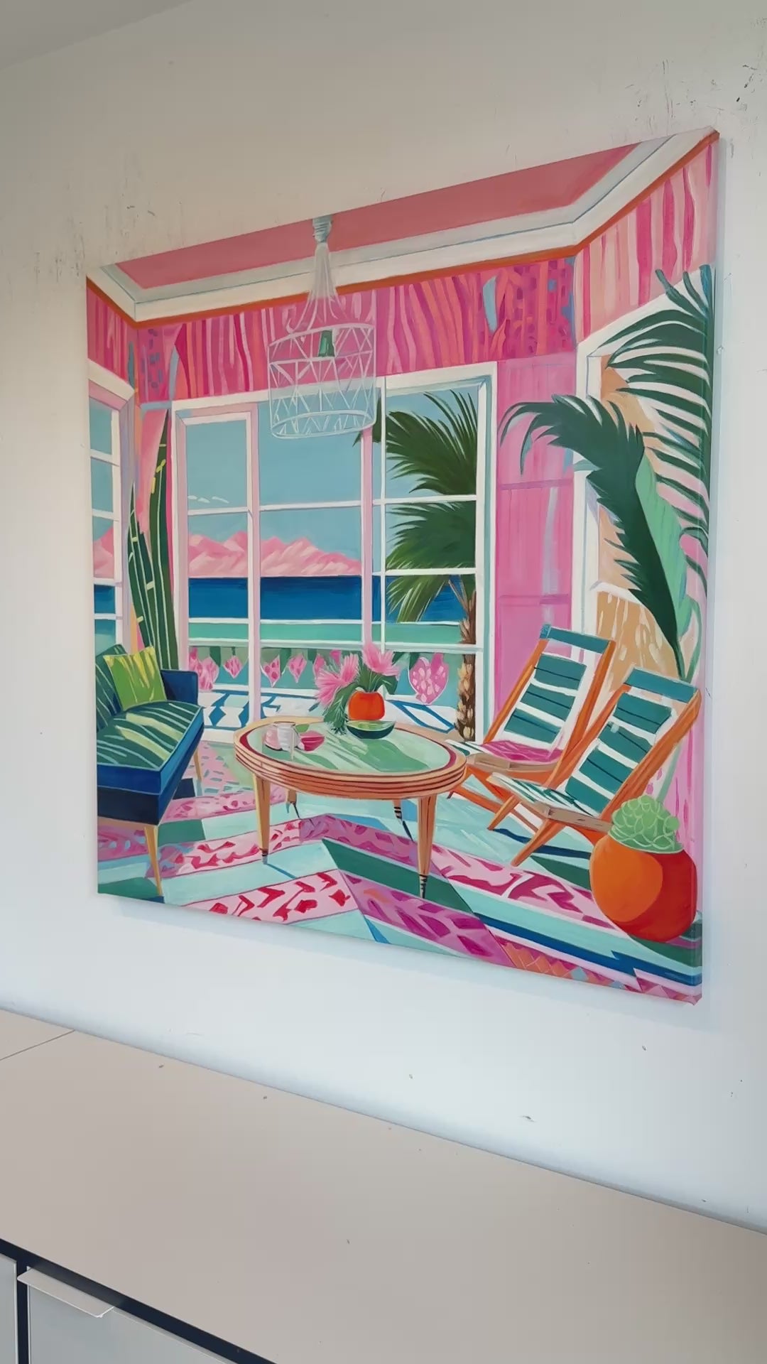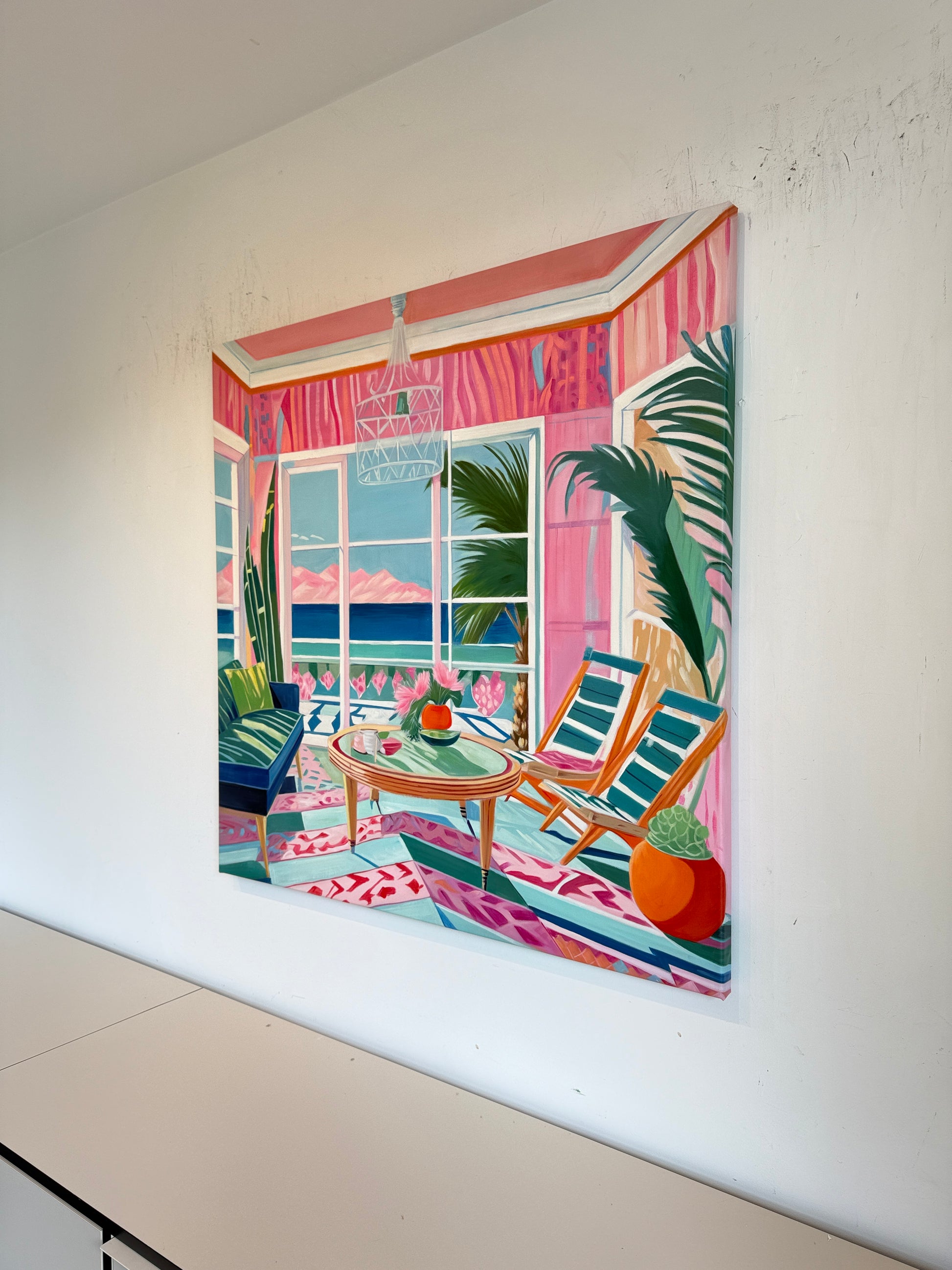 With bold colours, soft light, and breezy compositions, the paintings capture the laid-back rhythm of holiday life. Added thread details, carefully stitched into the canvas, highlight small elements and bring a subtle, tactile layer to the work — adding intimacy and depth without overpowering the calm, open feel of each piece.