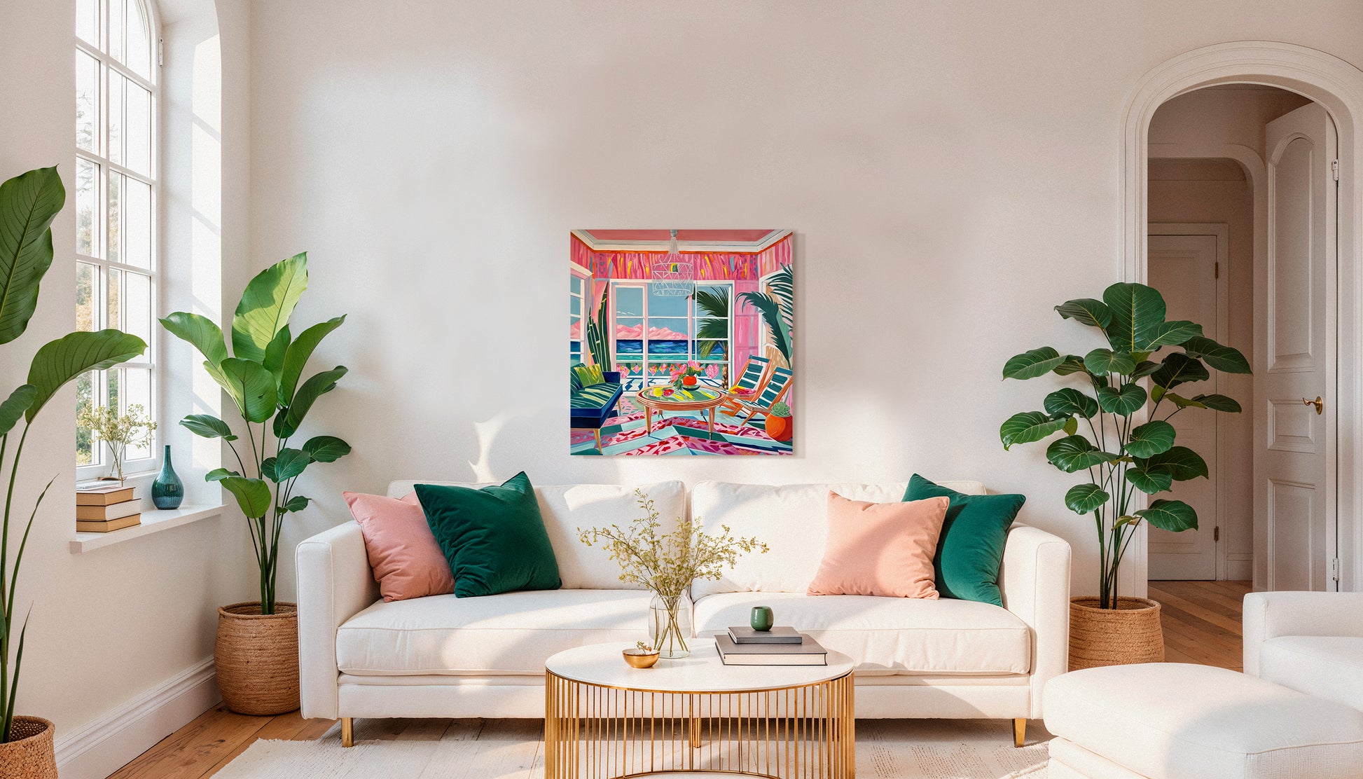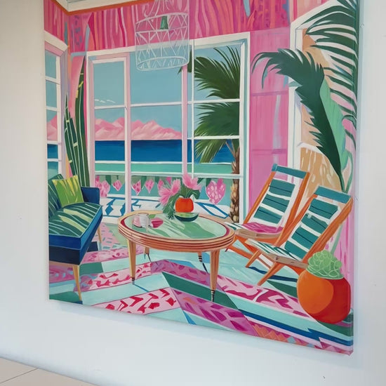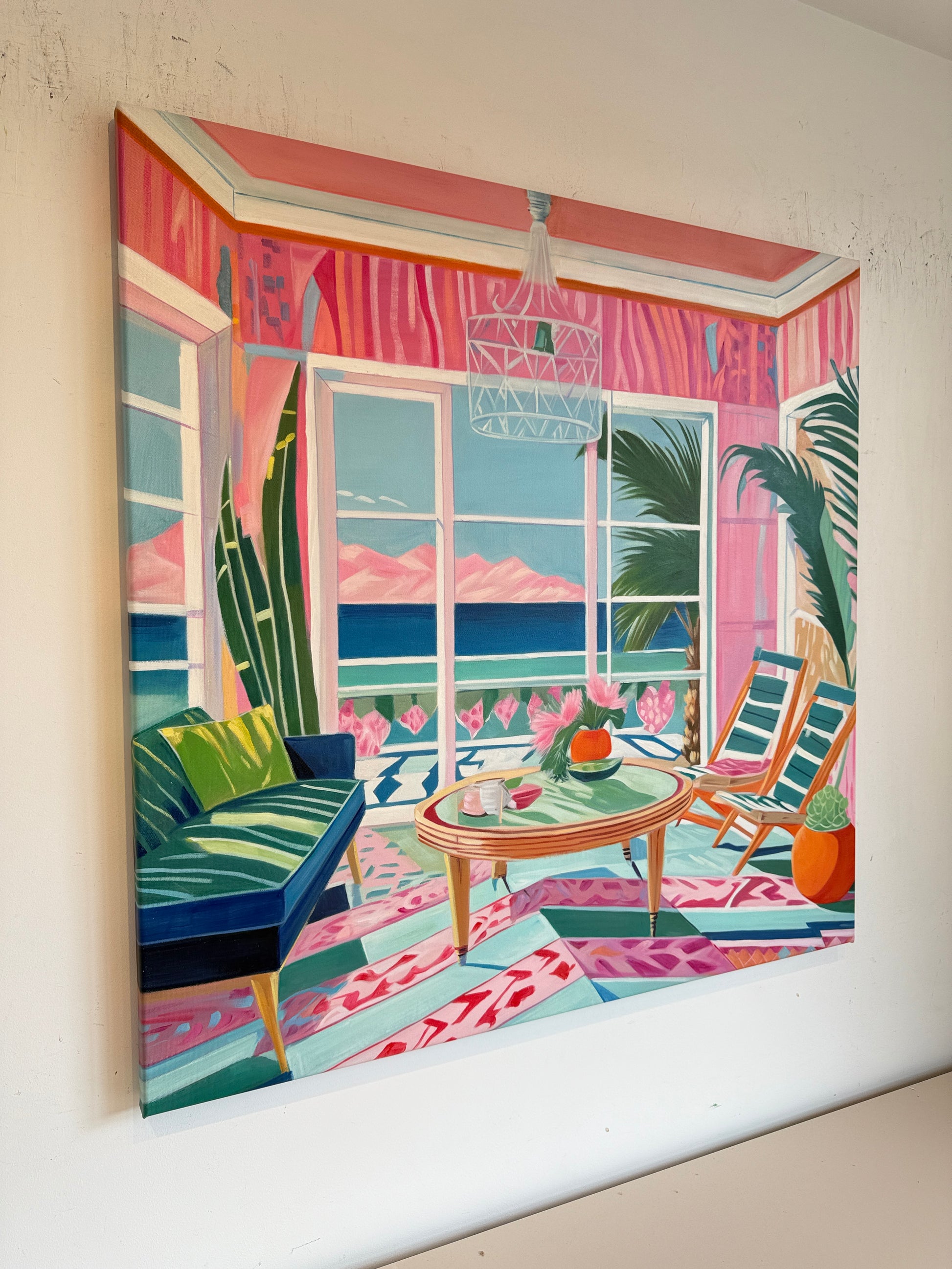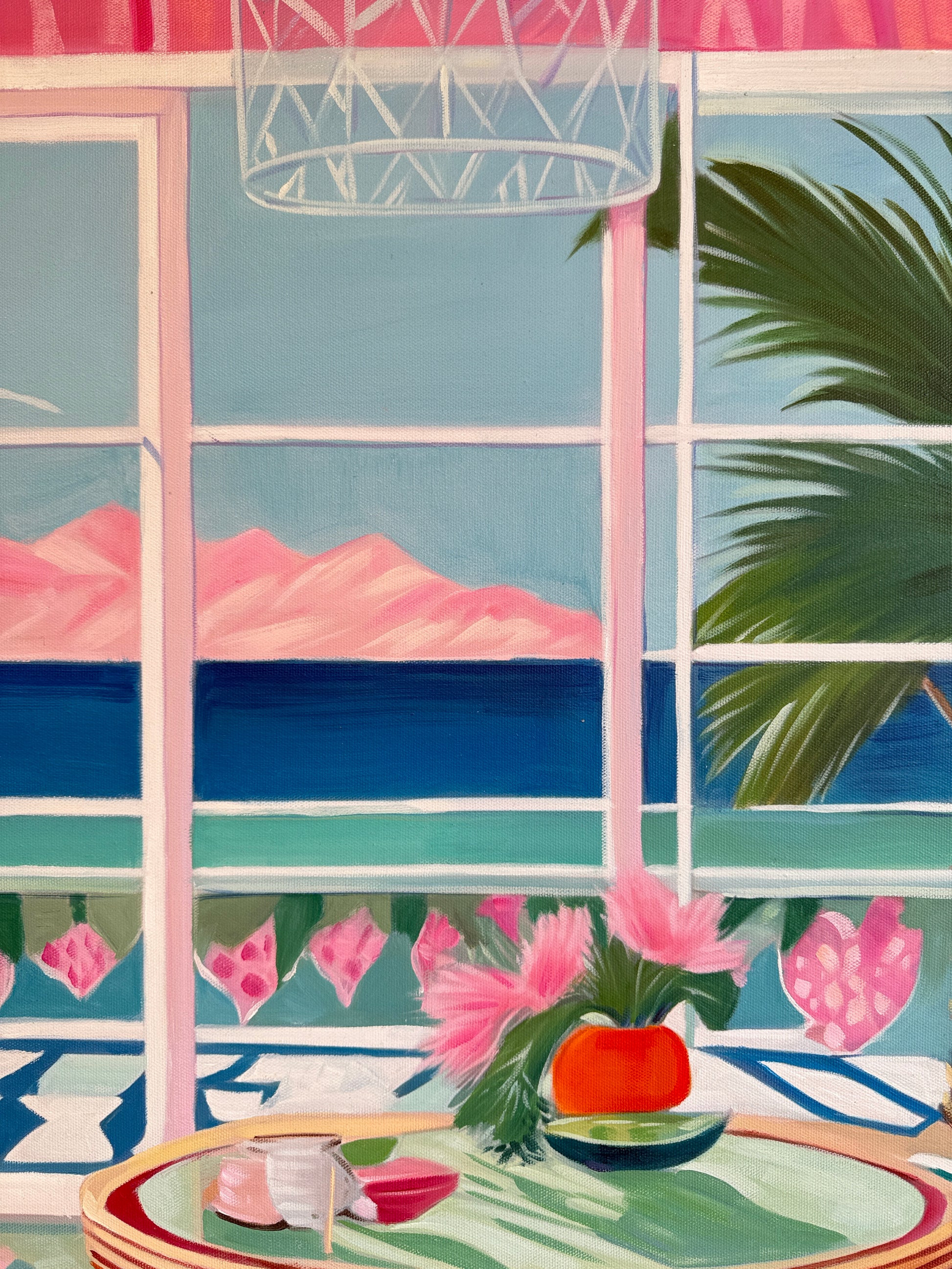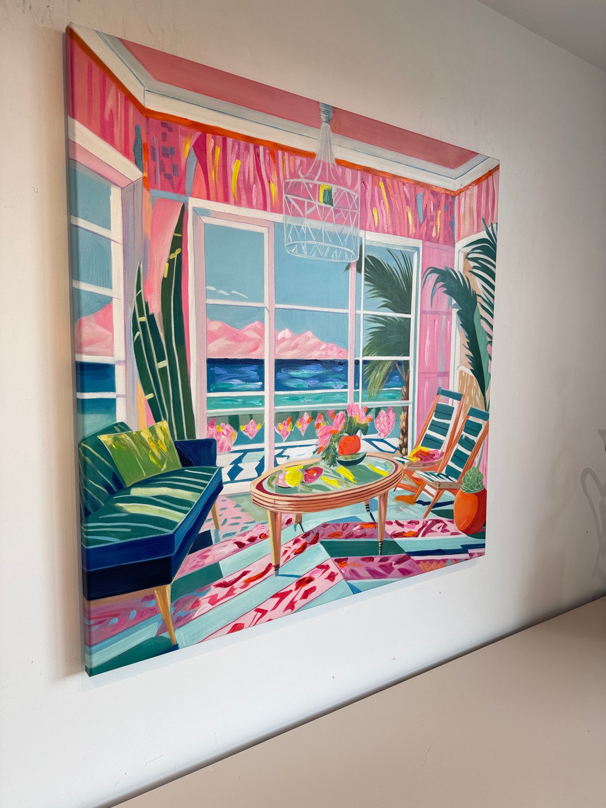 With bold colours, soft light, and breezy compositions, the paintings capture the laid-back rhythm of holiday life. Added thread details, carefully stitched into the canvas, highlight small elements and bring a subtle, tactile layer to the work — adding intimacy and depth without overpowering the calm, open feel of each piece.