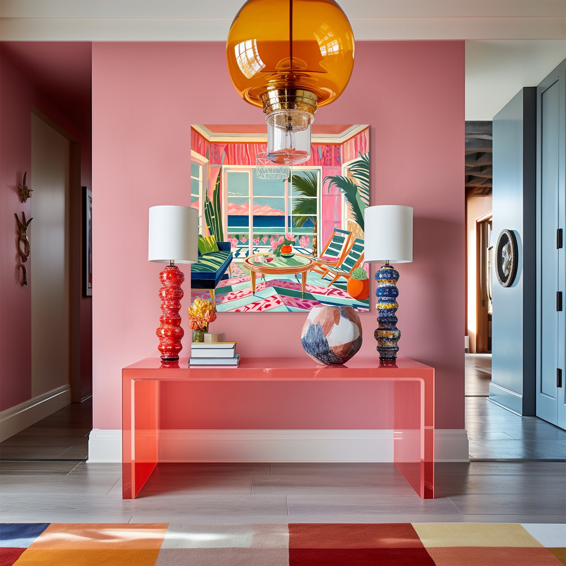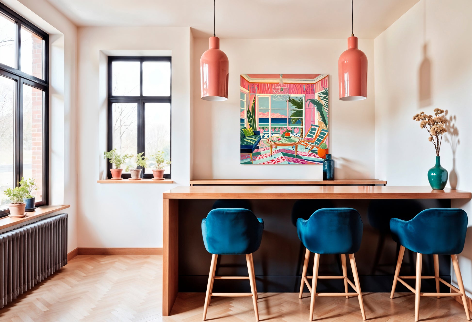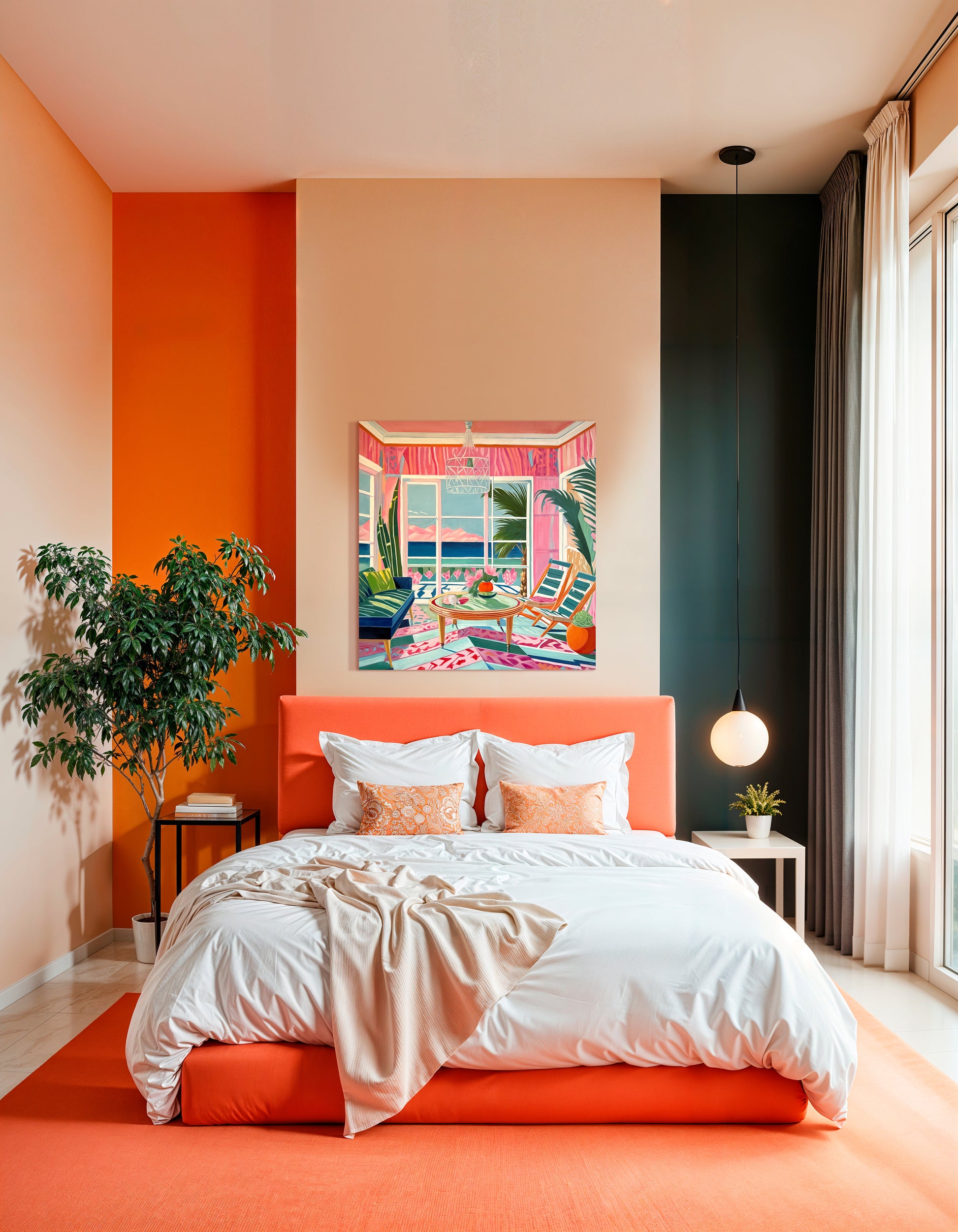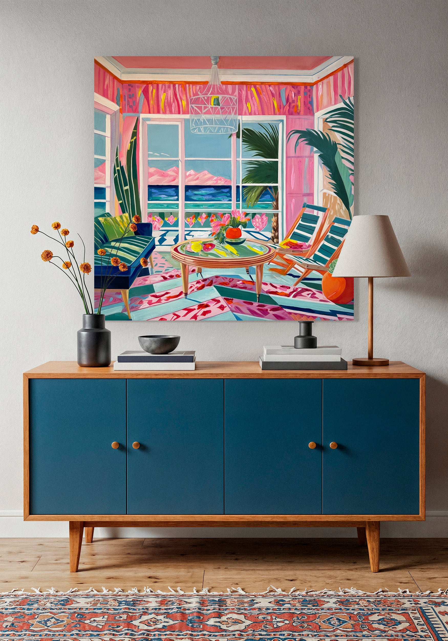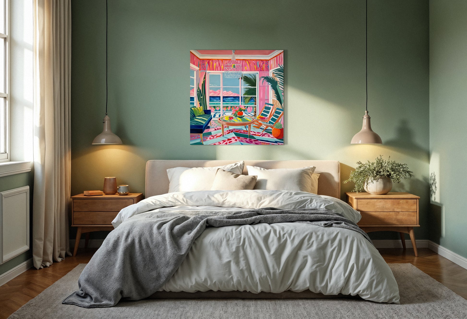 With bold colours, soft light, and breezy compositions, the paintings capture the laid-back rhythm of holiday life. Added thread details, carefully stitched into the canvas, highlight small elements and bring a subtle, tactile layer to the work — adding intimacy and depth without overpowering the calm, open feel of each piece.