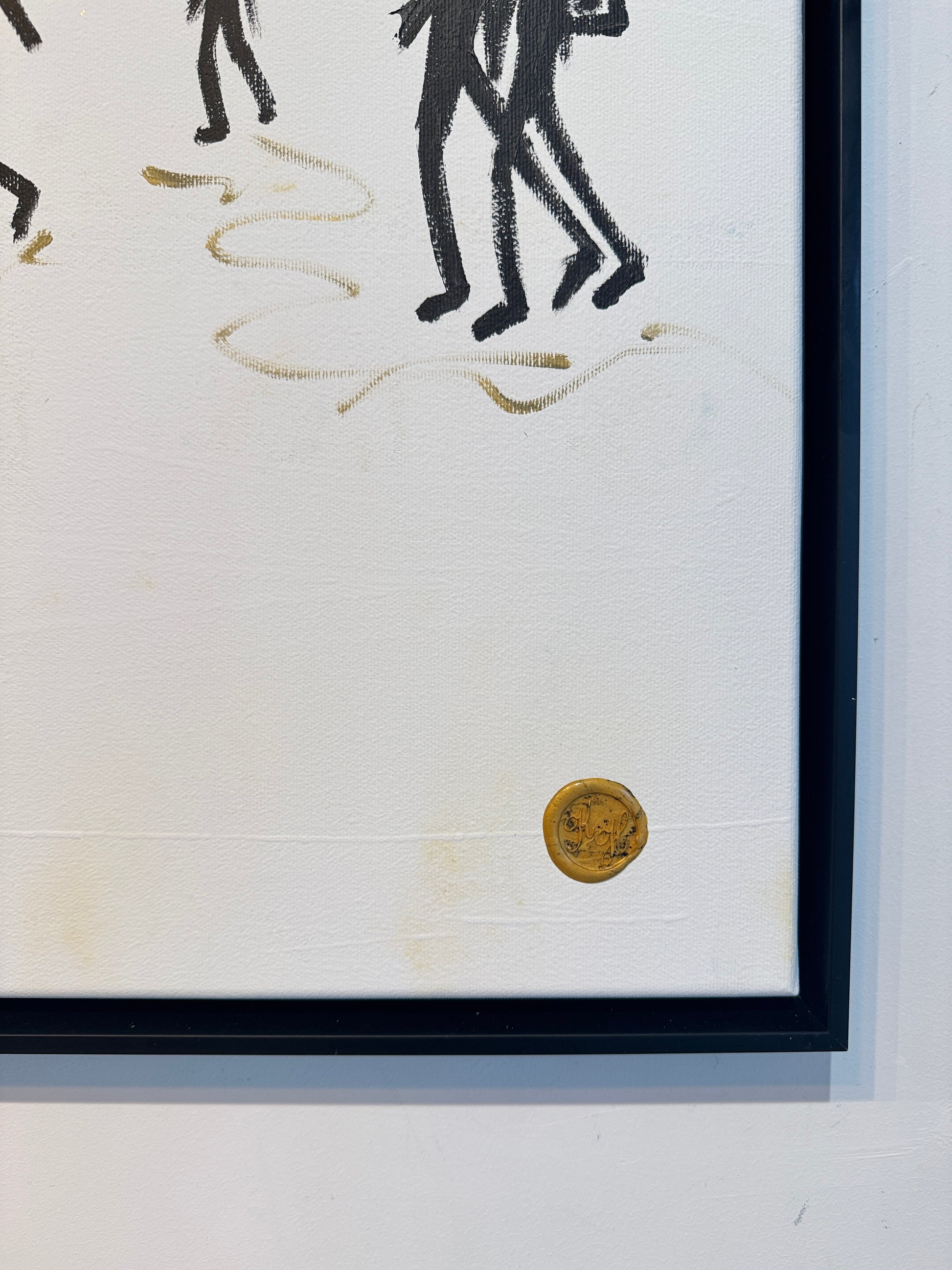 Medium: Acrylics, Waterbased Oil, Spraypaint on Linen Canvas in wood shadow box frame