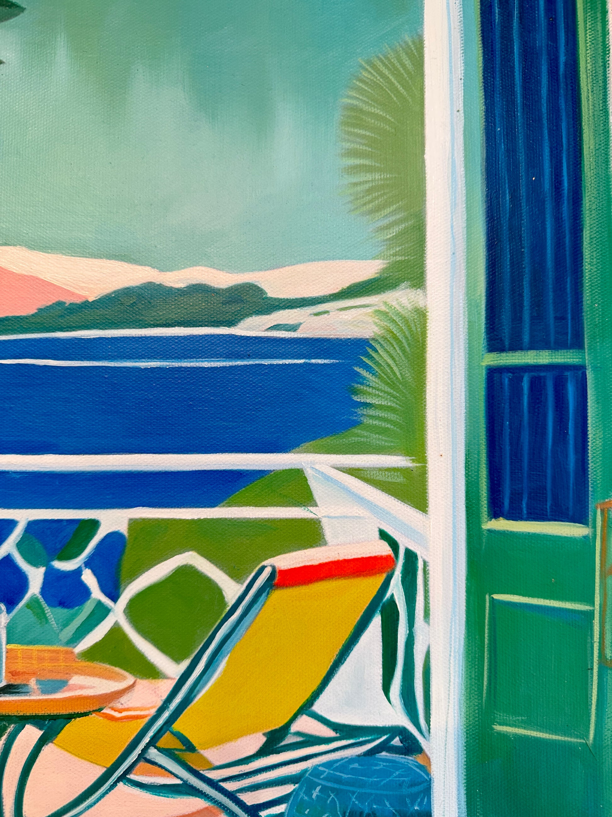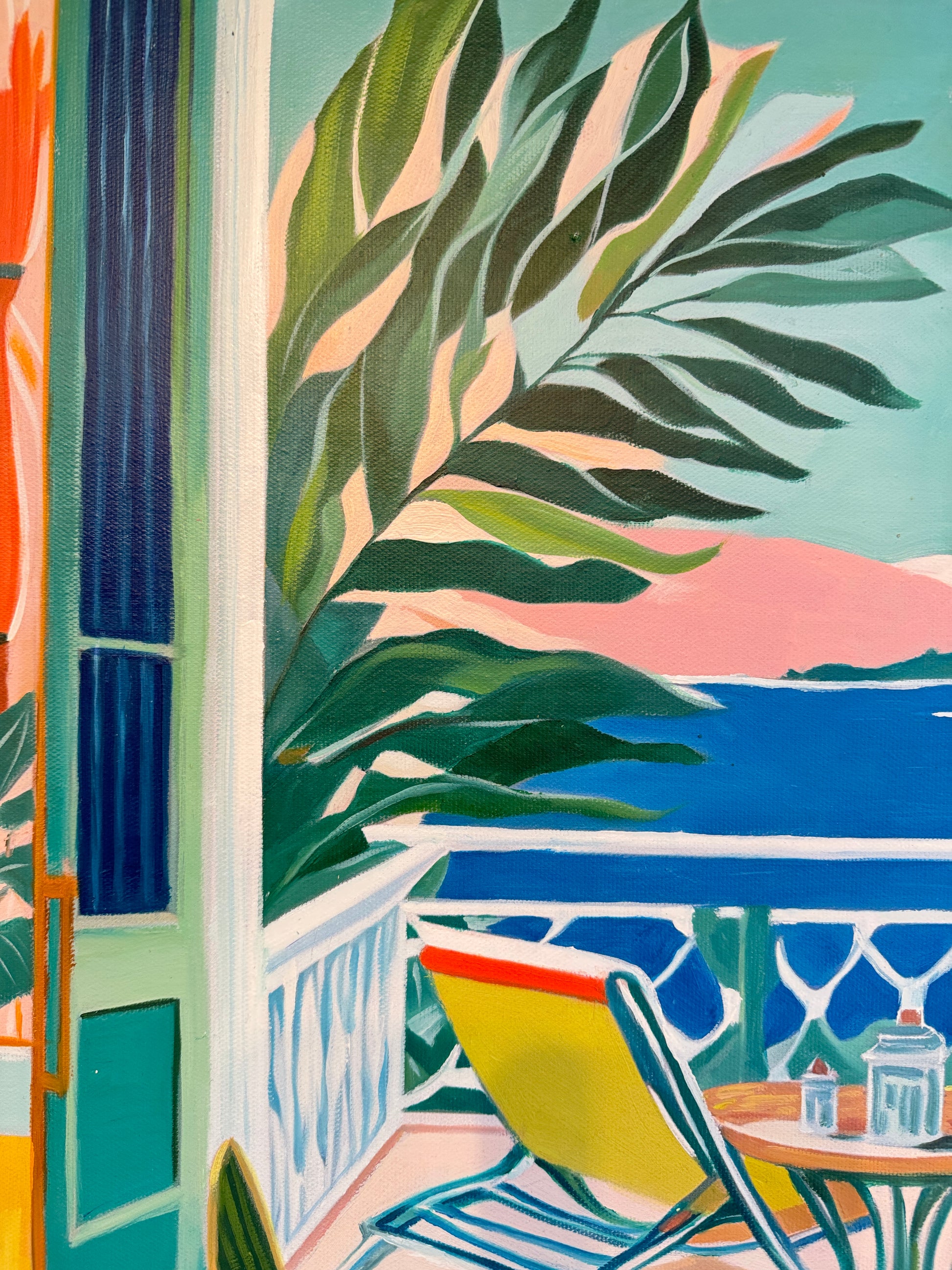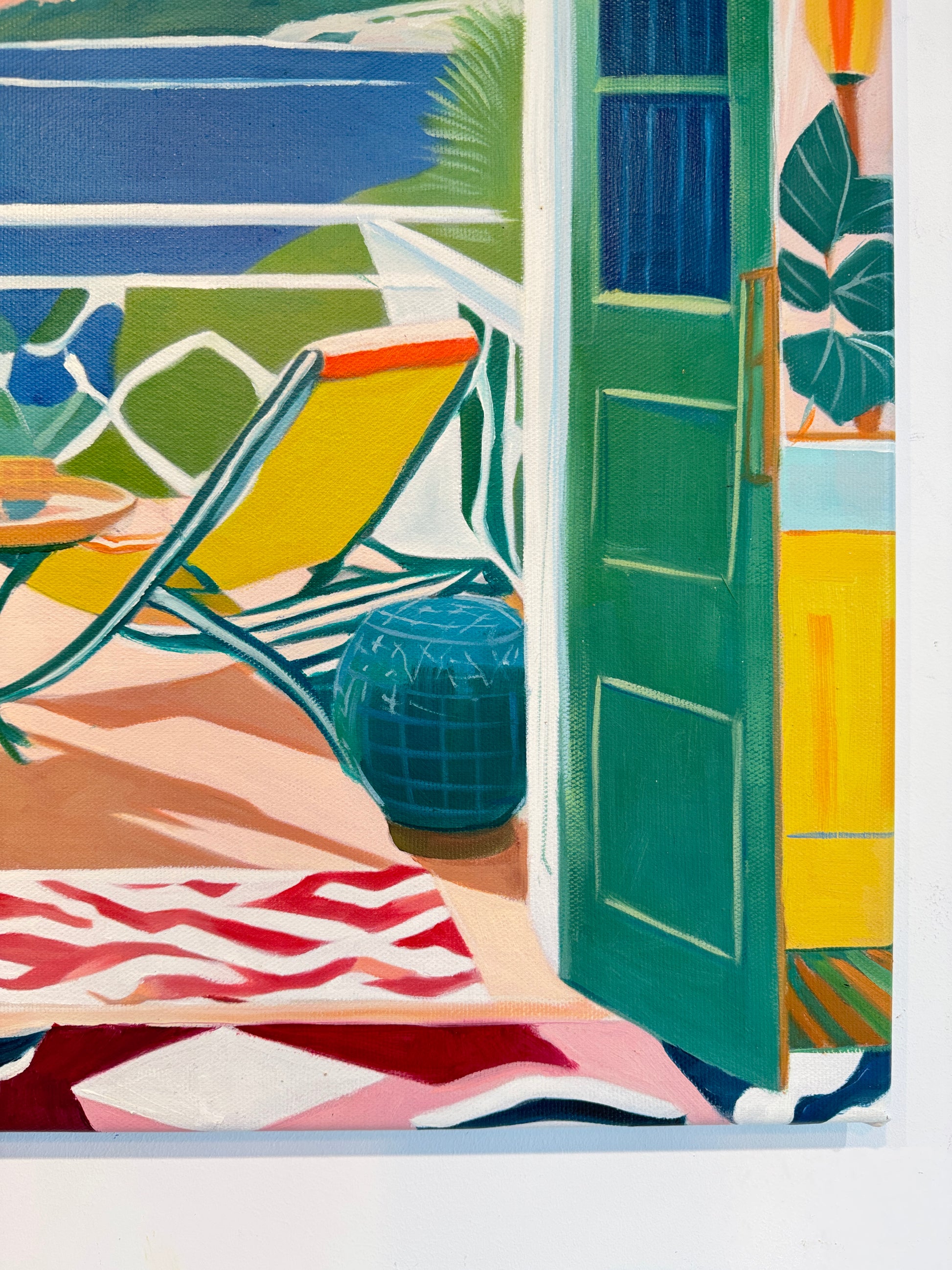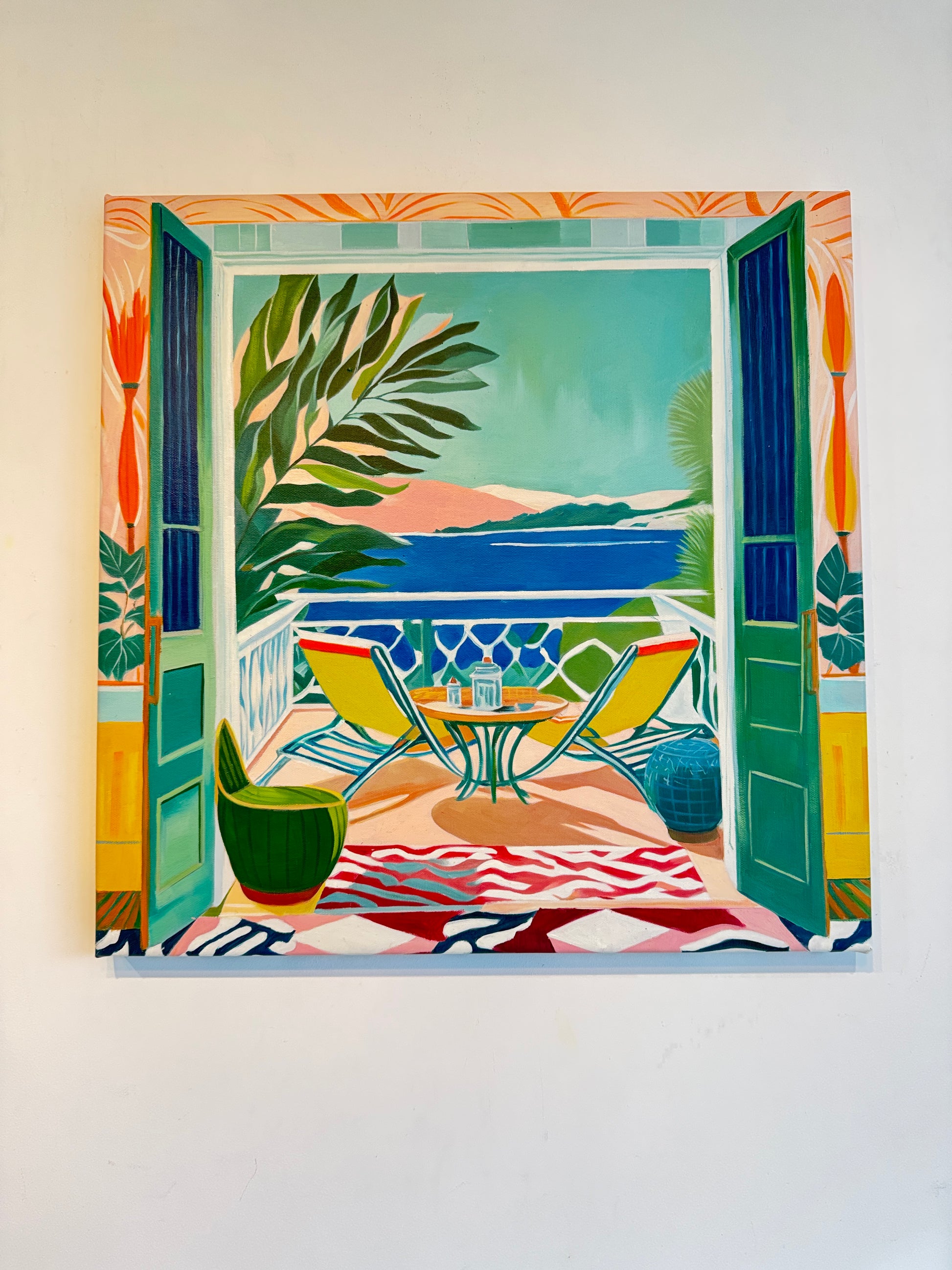 With bold colours, soft light, and breezy compositions, the paintings capture the laid-back rhythm of holiday life. Added thread details, carefully stitched into the canvas, highlight small elements and bring a subtle, tactile layer to the work — adding intimacy and depth without overpowering the calm, open feel of each piece.