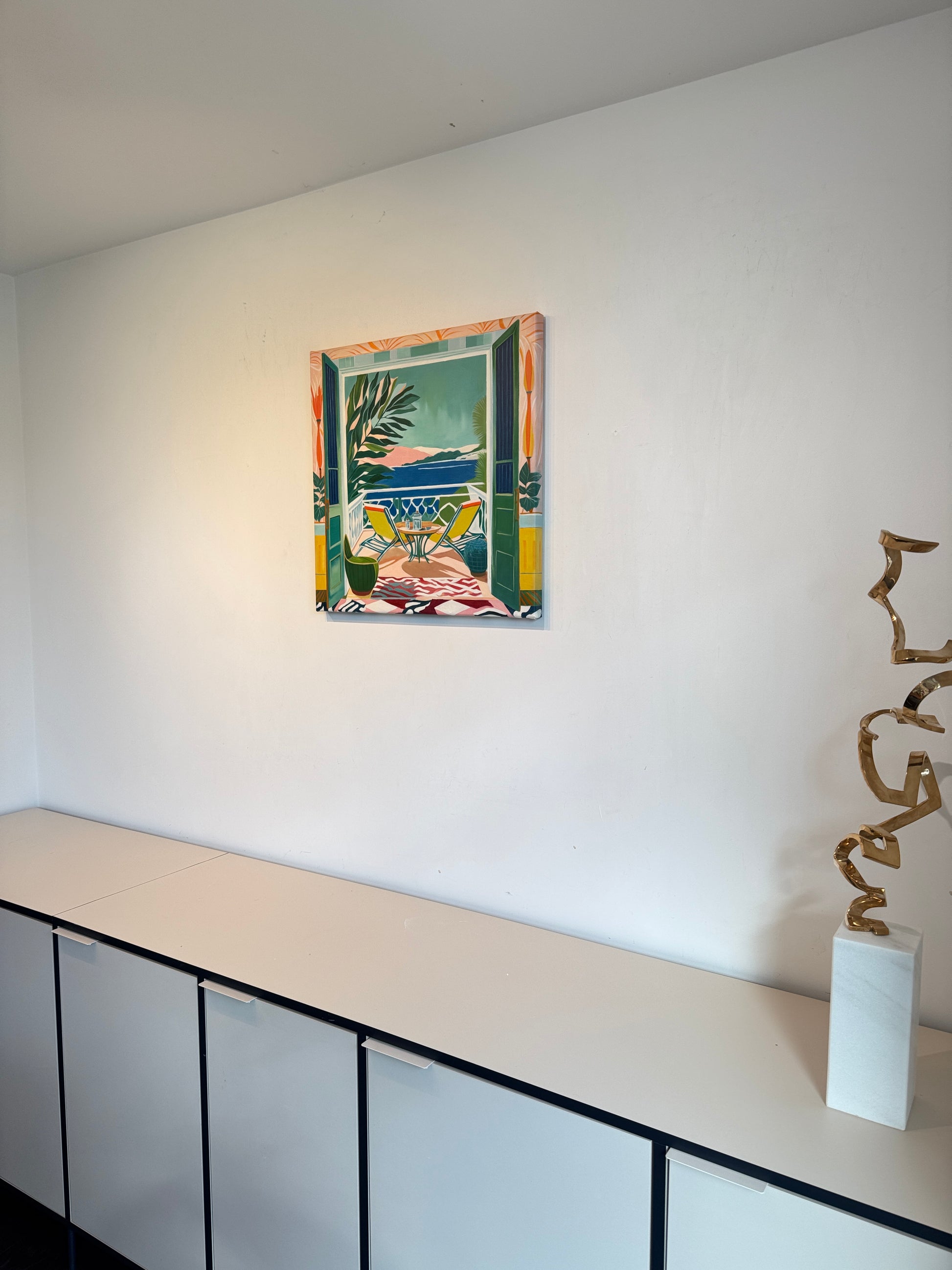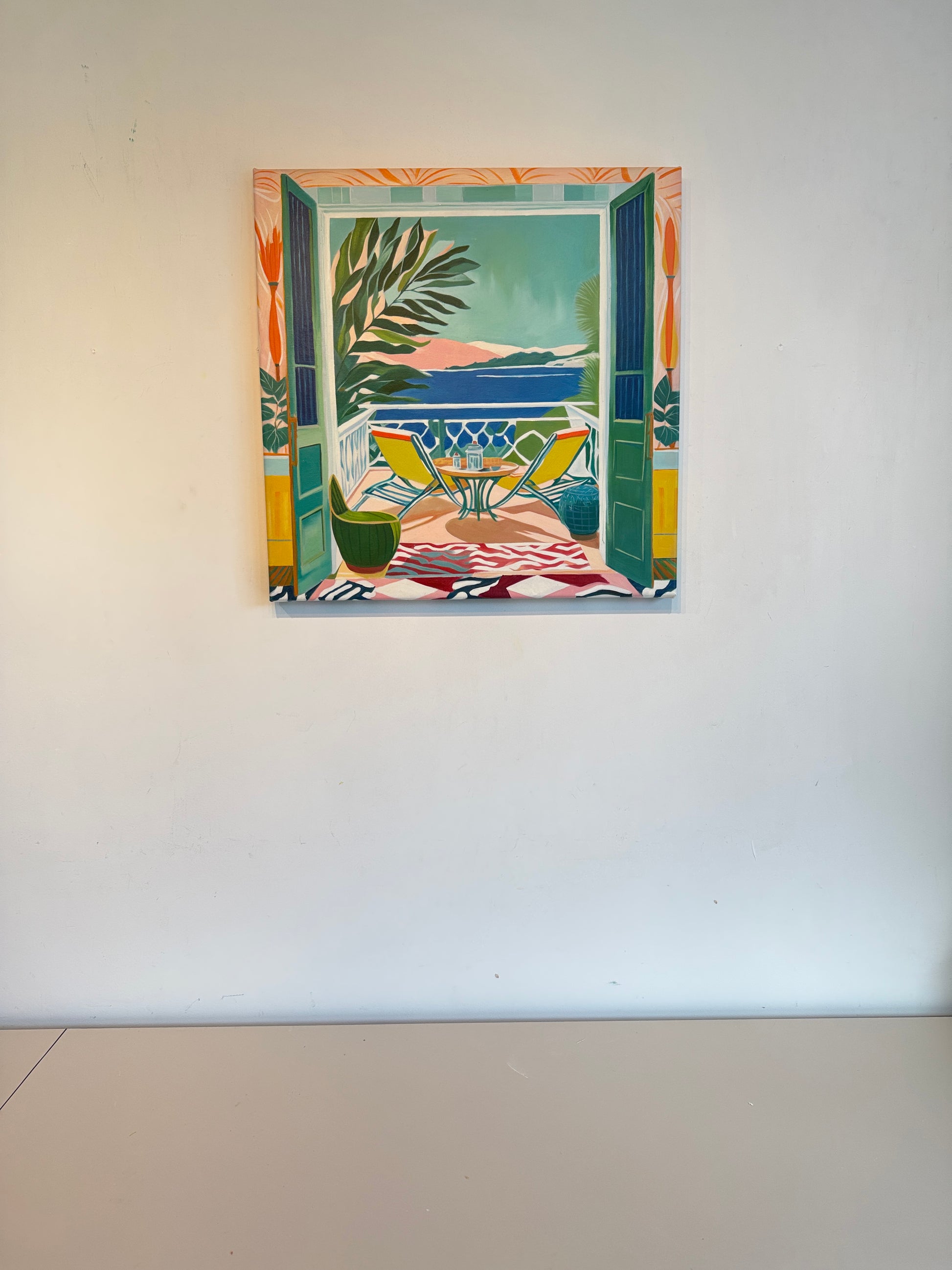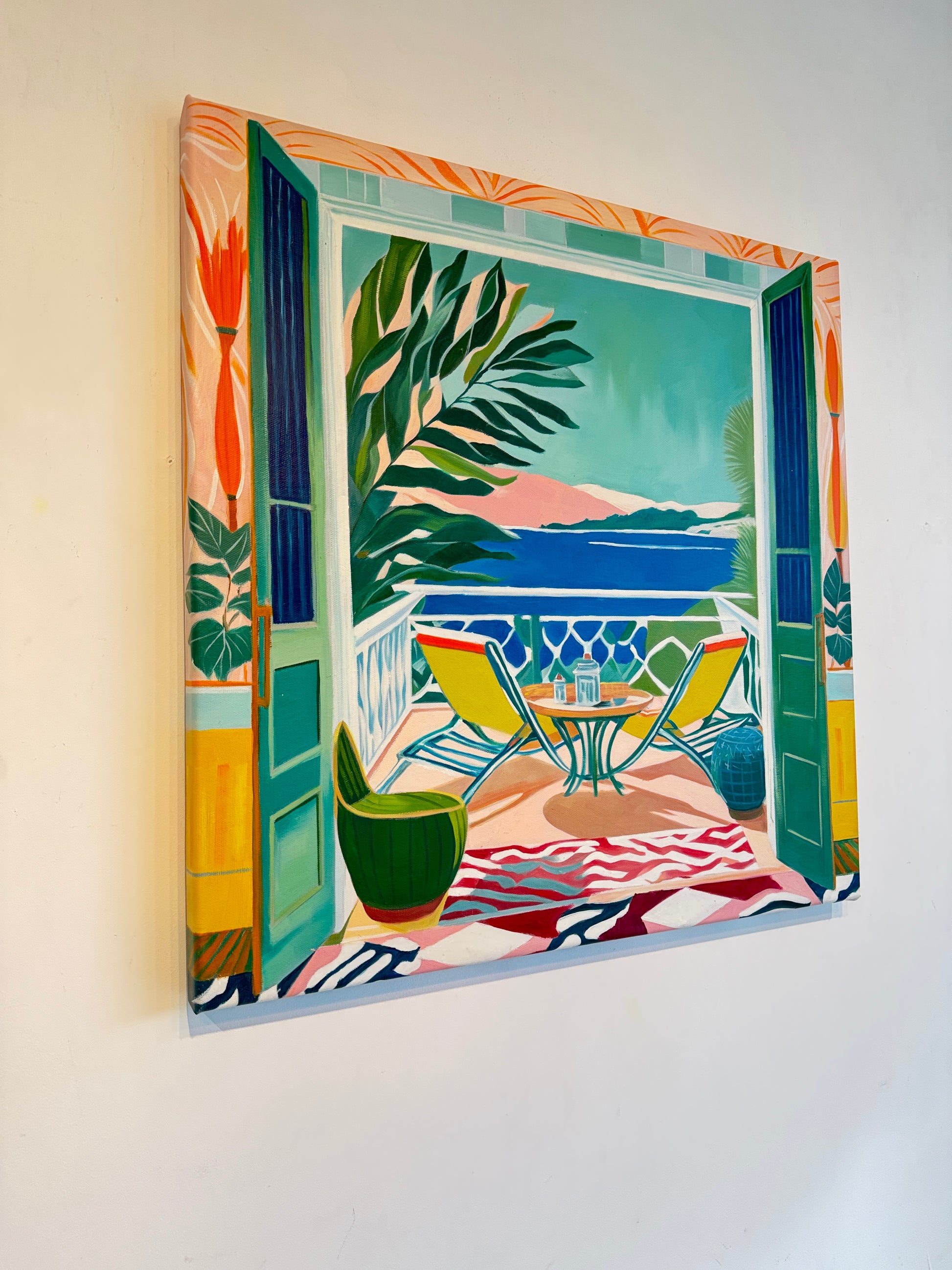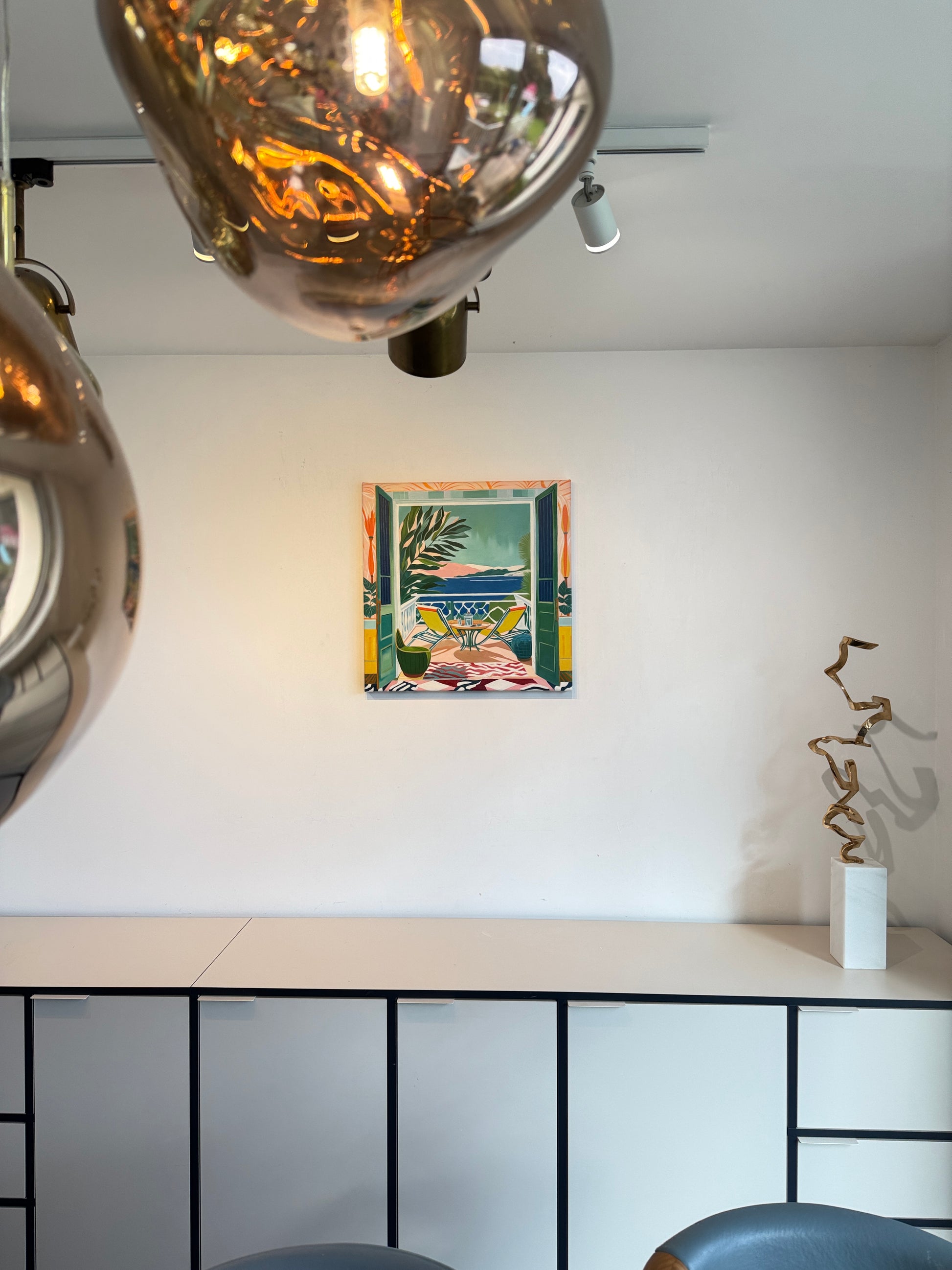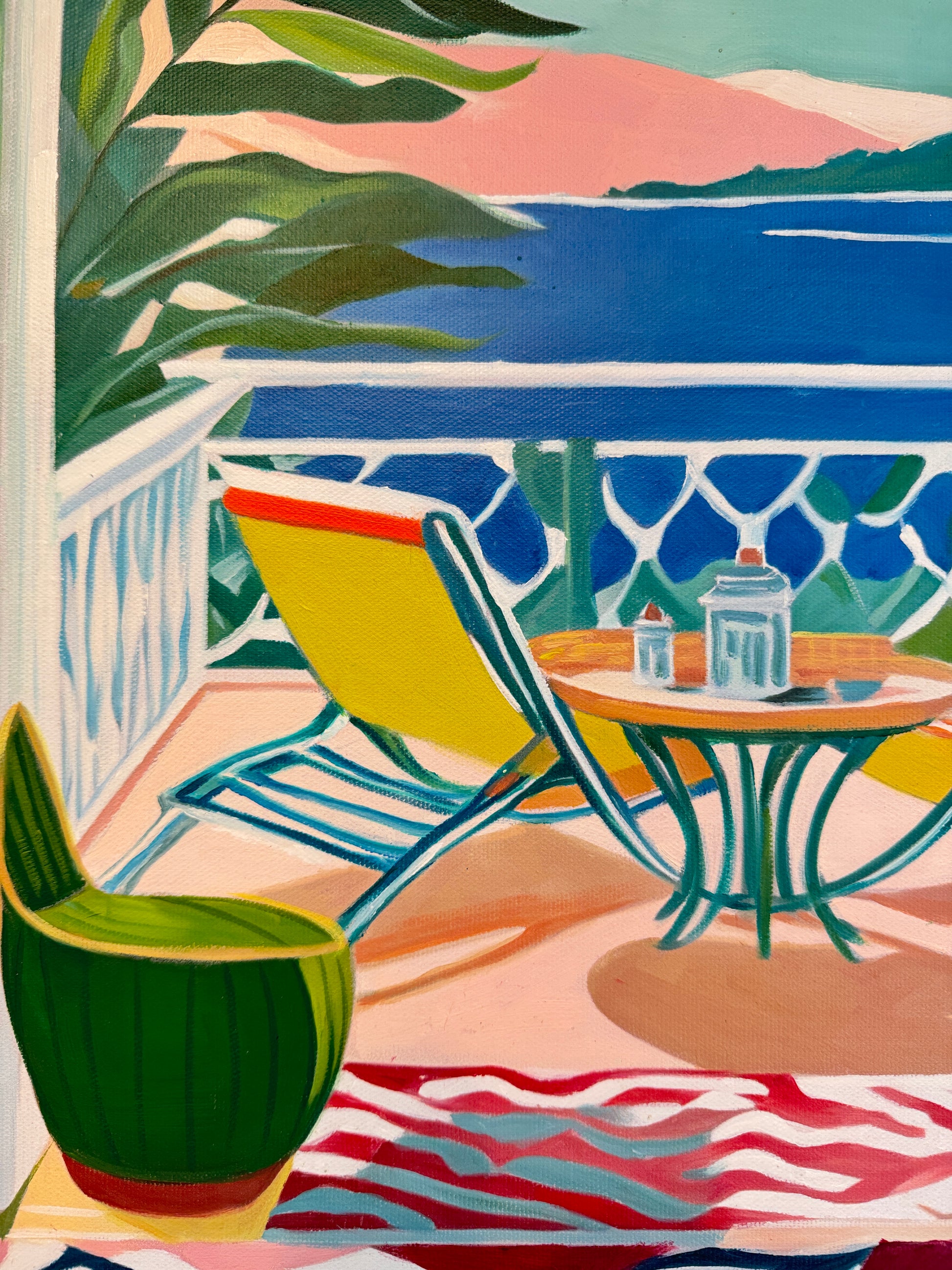 With bold colours, soft light, and breezy compositions, the paintings capture the laid-back rhythm of holiday life. Added thread details, carefully stitched into the canvas, highlight small elements and bring a subtle, tactile layer to the work — adding intimacy and depth without overpowering the calm, open feel of each piece.