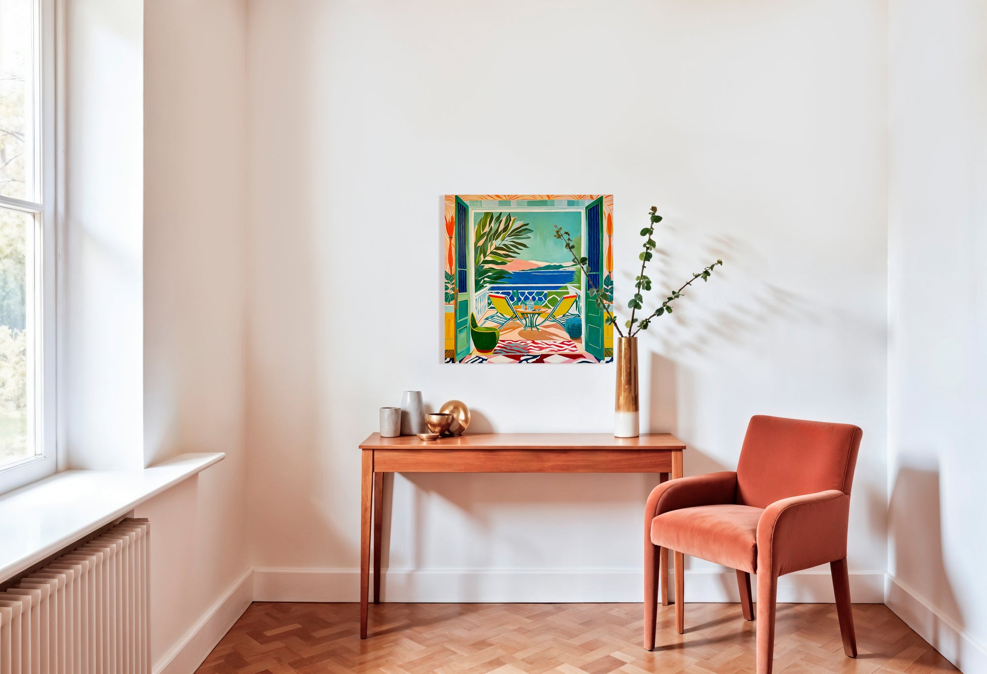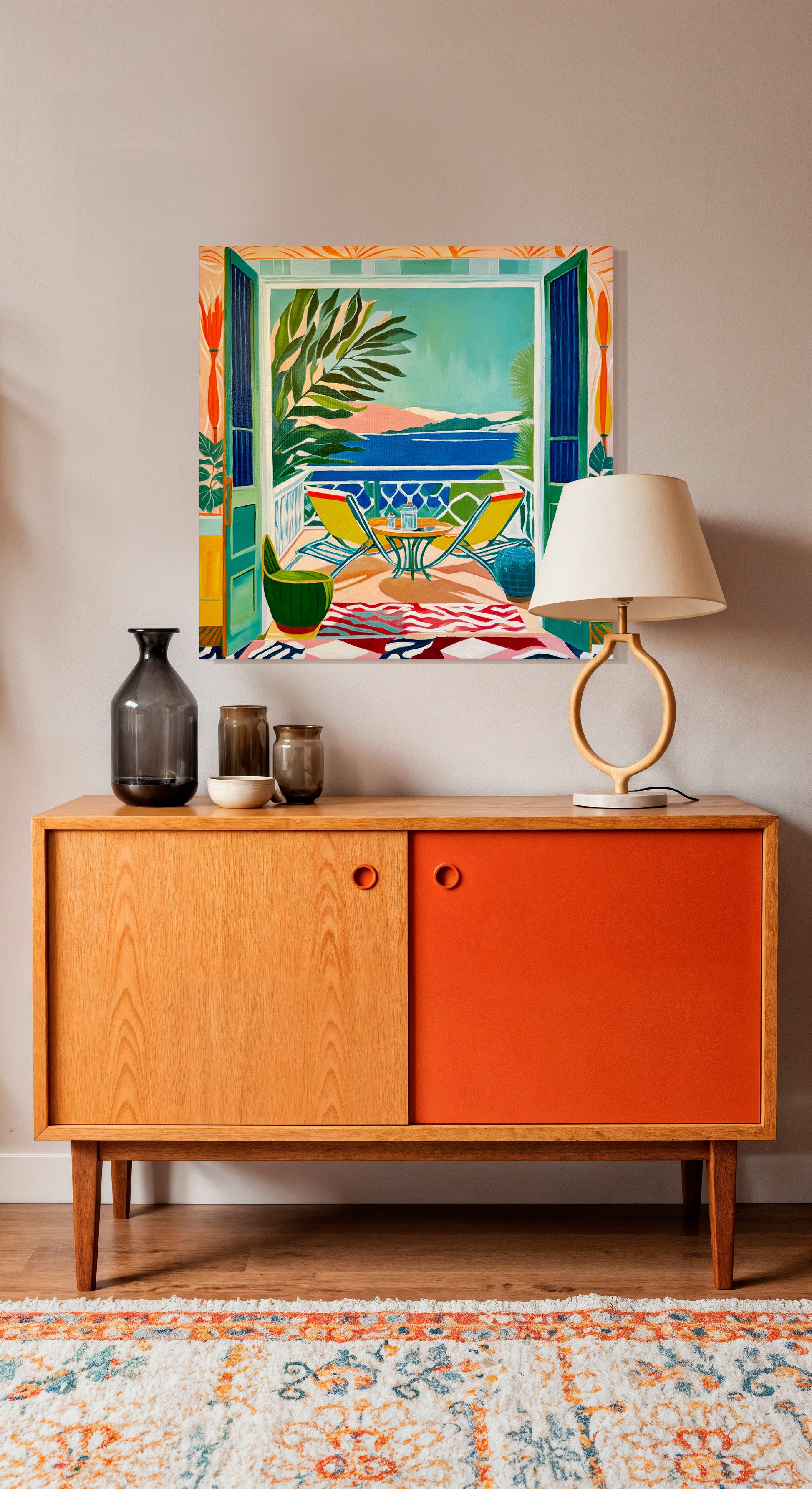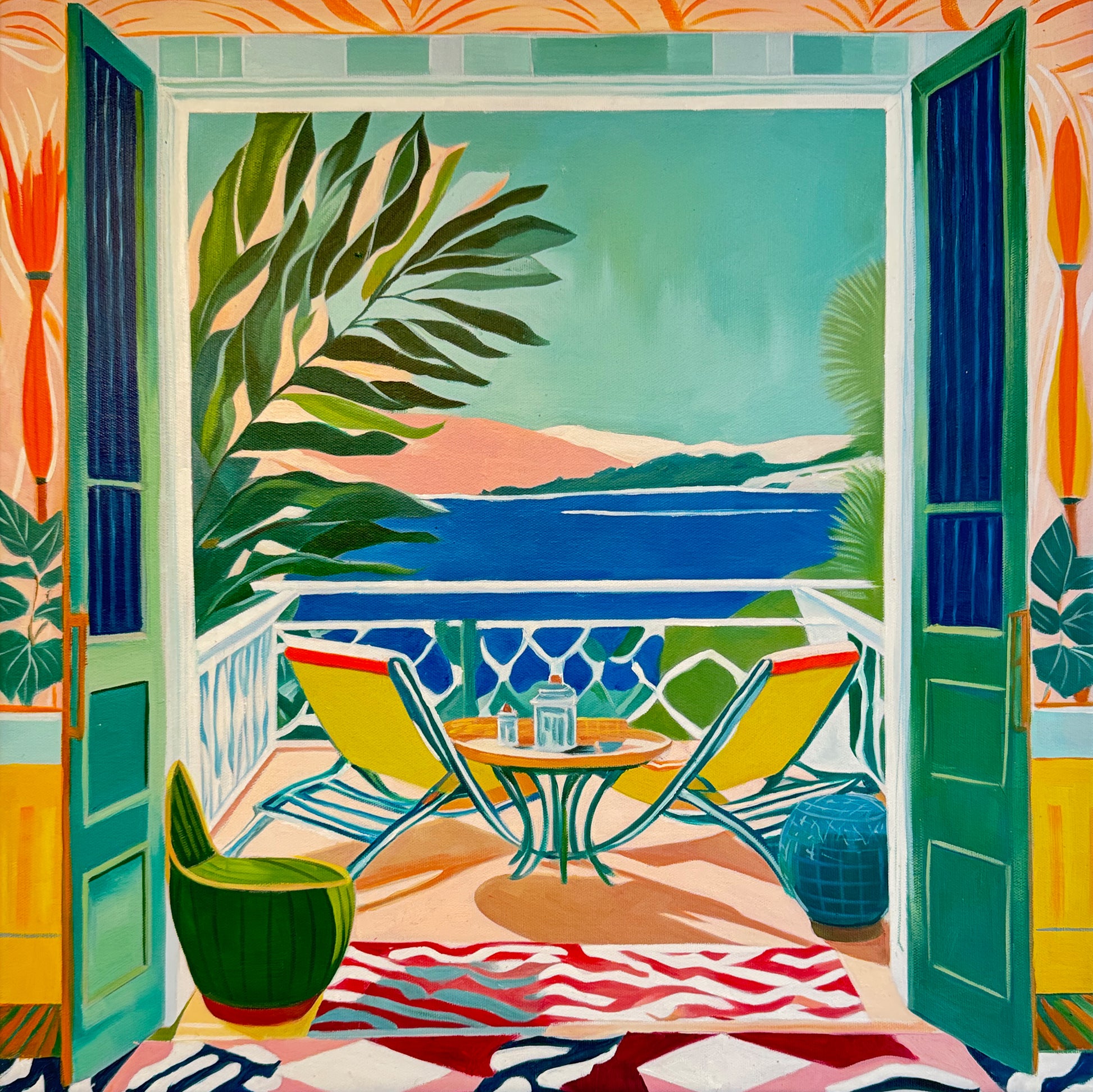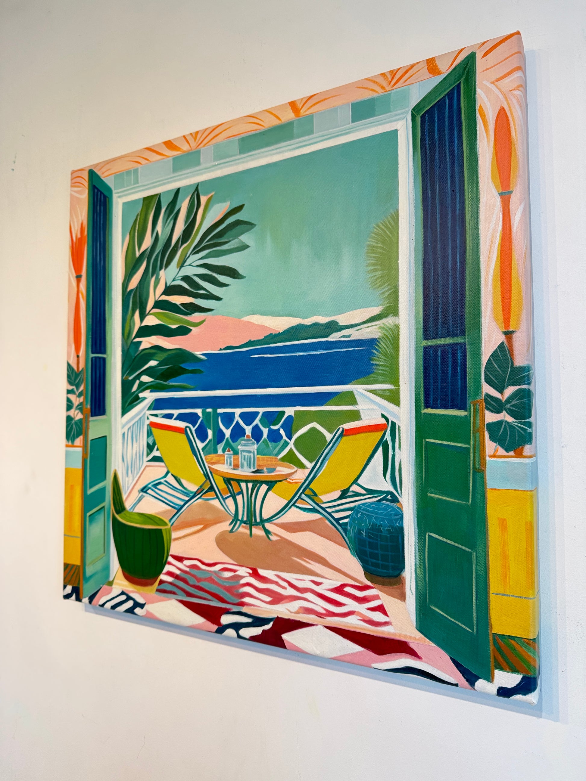 With bold colours, soft light, and breezy compositions, the paintings capture the laid-back rhythm of holiday life. Added thread details, carefully stitched into the canvas, highlight small elements and bring a subtle, tactile layer to the work — adding intimacy and depth without overpowering the calm, open feel of each piece.